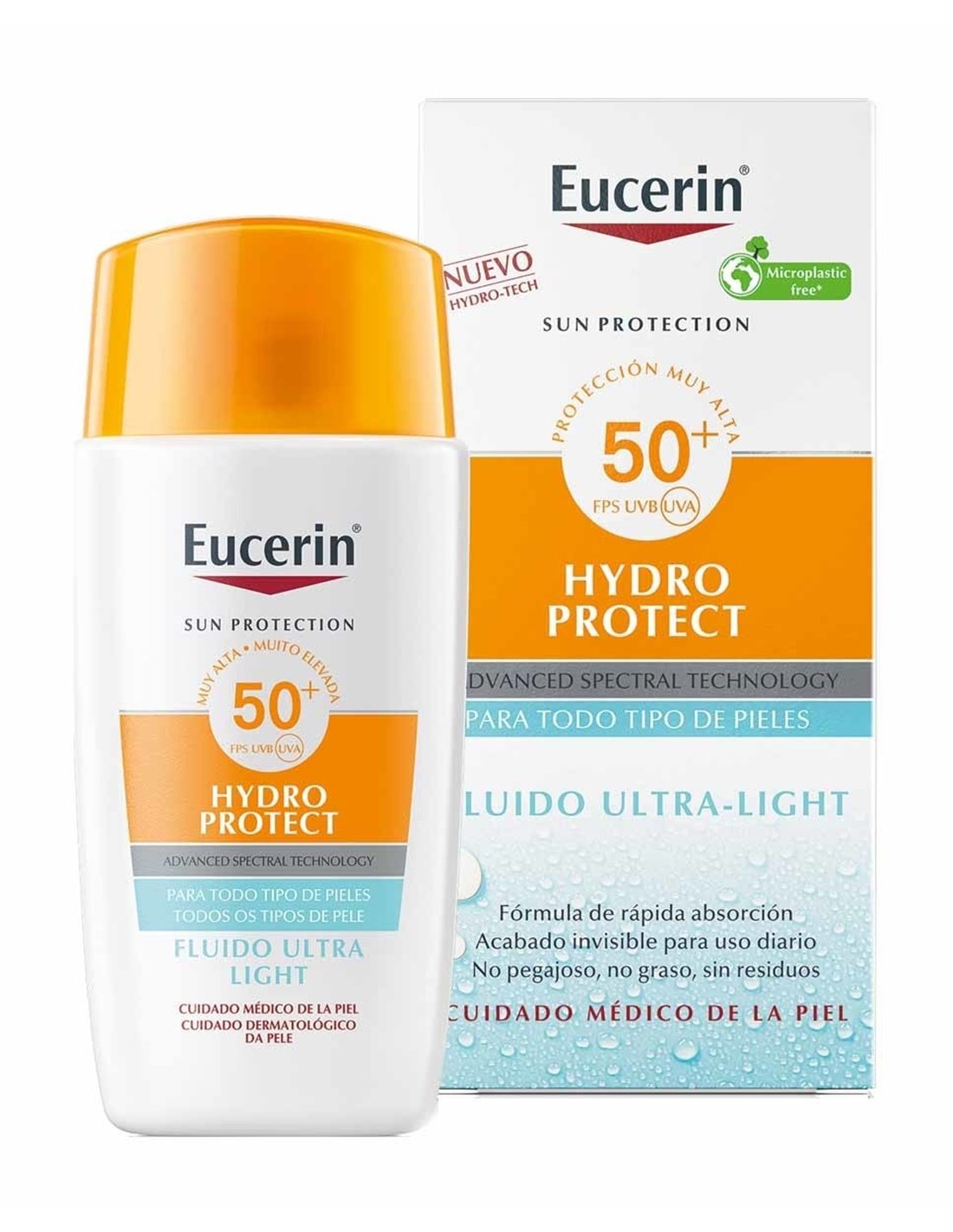 EUCERINEucerin Sun Face Hydro Protect Ultra-Light Fluid FPS 50+ es un protector solar diario con complejo hidrotecnológico para una hidratación inmediata y una sensación de frescor en la piel que protege contra los daños provocados por el sol. La Advanced Spectral Technology combina filtros fotoestables y de amplio espectro frente a los rayos UVA y UVB1. Ofrece una protección muy alta contra los rayos UV con licocalcón A para neutralizar los radicales libres producidos por la luz UV y HEVL. El fluido solar también contiene ácido glicirretínico, que estimula el mecanismo de reparación del ADN de la piel. Perfumado y con una fórmula ultraligera, no grasa y de absorción rápida que no deja residuos después del uso, Eucerin Sun Face Hydro Protect Ultra-Light Fluid FPS 50+ ha demostrado clínica y dermatológicamente una excelente tolerancia en todos los tipos de piel, incluida la piel sensible.