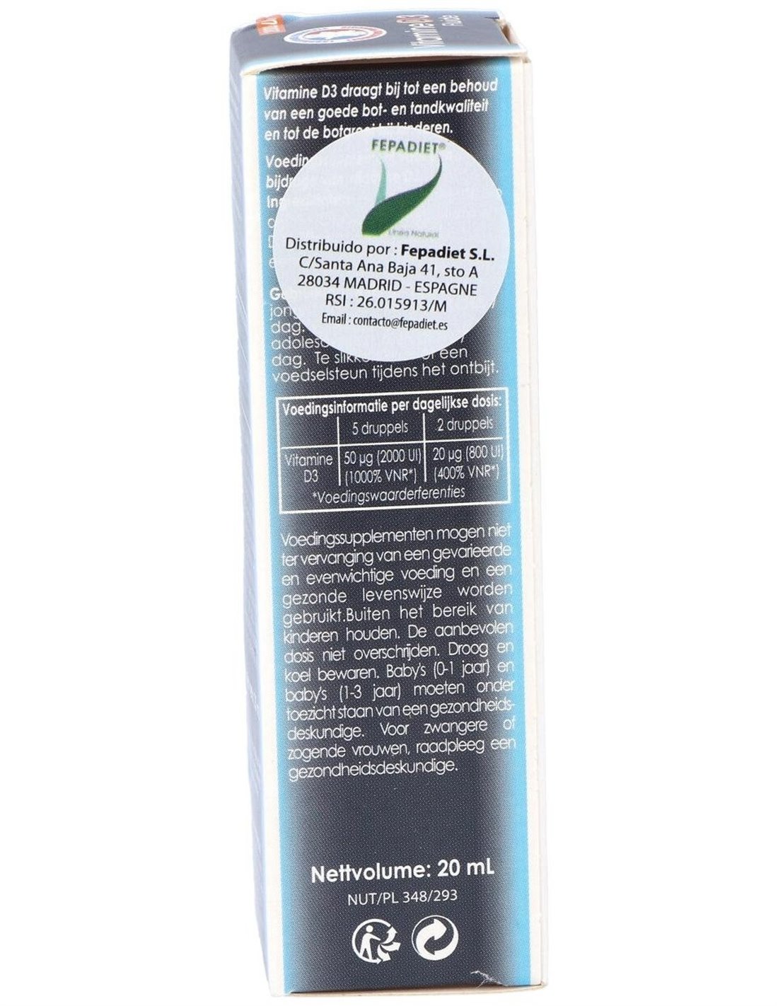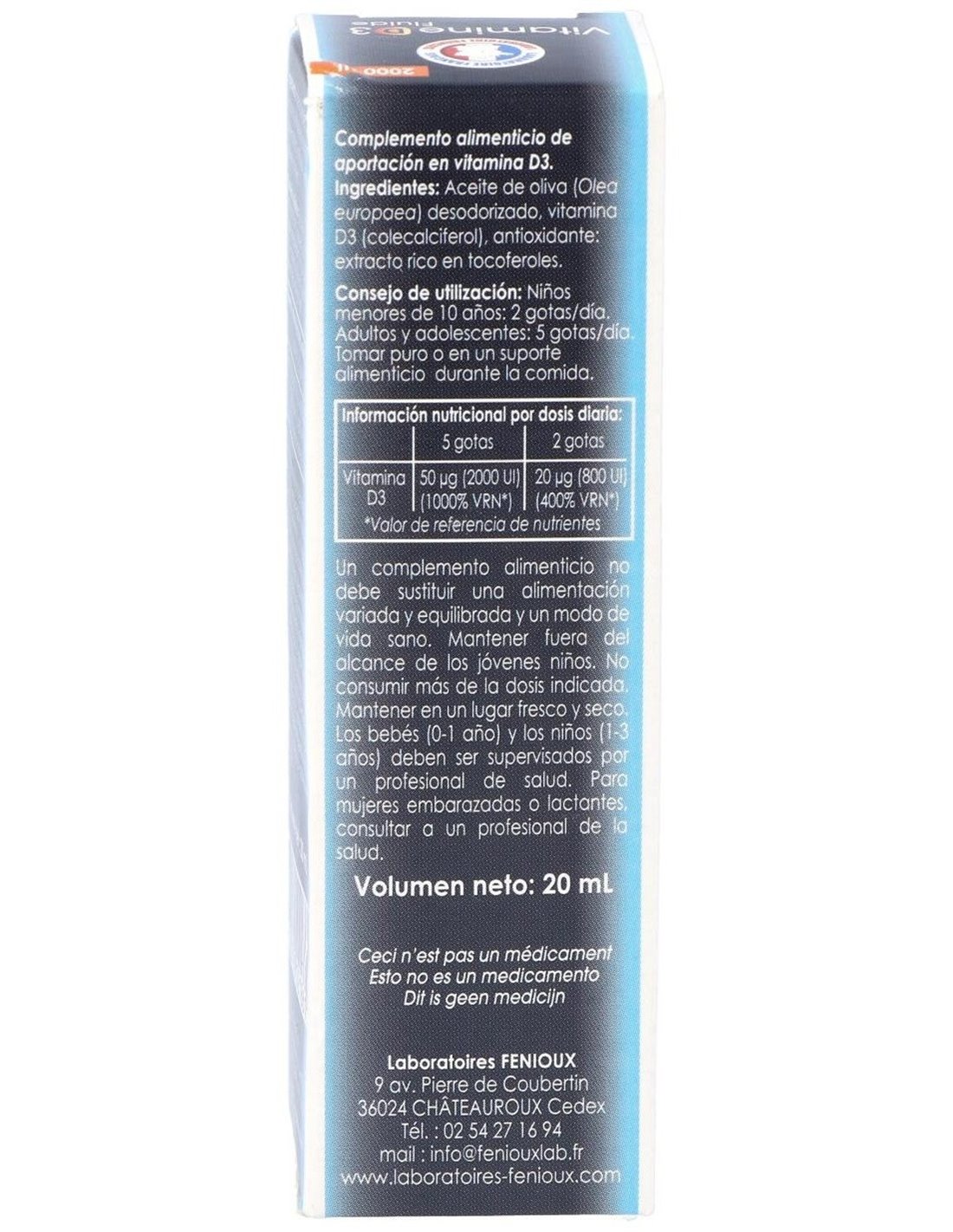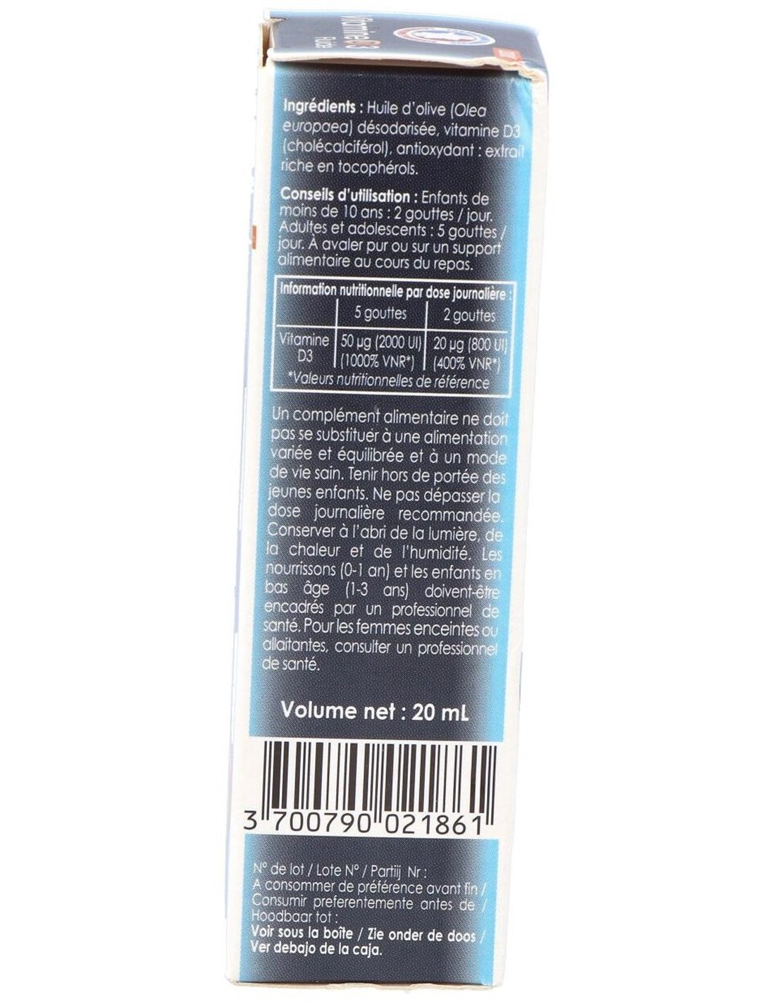 Complemento alimenticio en formato líquido, elaborado a base de vitamina D3, que es esencial para obtener unos huesos y dientes saludables. Contribuye a reforzar el sistema inmune, al funcionamiento normal de los músculos y para mejorar la absorción y utilización del calcio y el fósforo. Además, contribuye al proceso de división celular y al mantenimiento de los niveles normales de calcio en sangre, por lo que es particularmente importante durante los meses de invierno y sobre todo en las personas mayores, ya que la capacidad del cuerpo para producir vitamina D disminuye con la edad.