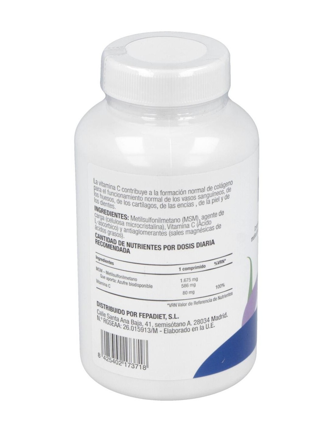 Complemento alimenticio a base de metilsulfonilmetano (MSM) y vitamina C. La vitamina C contribuye a la formación normal de colágeno para el funcionamiento normal de los vasos sanguíneos, de los huesos, de los cartílagos, de las encías , de la piel y de los dientes.