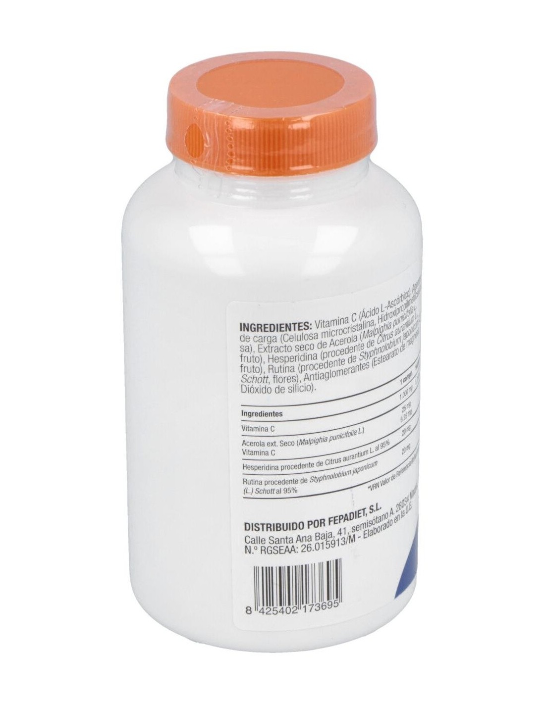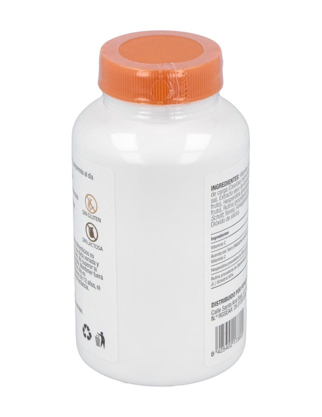 Vitamina C (Ácido L-Ascórbico), Agentes de carga (Celulosa microcristalina, Hidroxipropilmetilcelulosa), Extracto seco de Acerola (Malpighia punicifolia L., fruto), Hesperidina (procedente de Citrus aurantium L., fruto), Rutina (procedente de Styphnolobium japonicum (L.) Schott, flores), Antiaglomerantes (Estearato de magnesio, Dióxido de silicio).