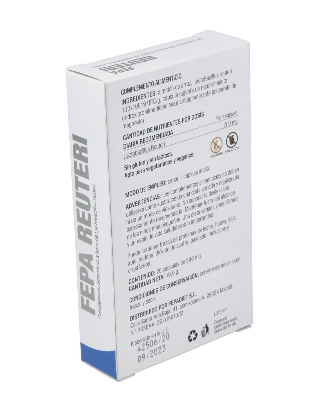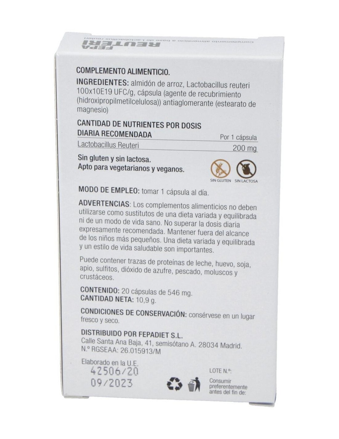 Lactobacillus Reuteri 100x 10E19 UFC/g 200 mg equivalente a 20.000 millones de (unidades formadoras de colonias). Almidón de arroz,antiaglomerantes: estearato de magnesio, Agente de recubrimiento Cápsula HPMC (hidroxipropilmetilcelulosa) vegetal DR (gastrorresistente).
