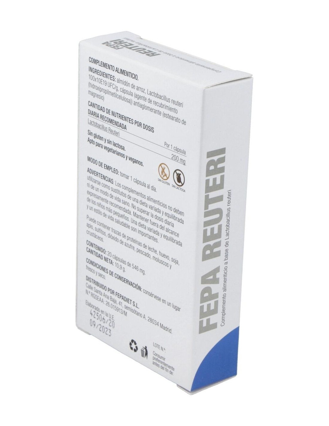 Complemento alimenticio en forma de cápsulas, elaborado a base de una cepa probiótica de lactobacillus reuteri, que ayuda a regular la flora intestinal, protegiendo así el sistema digestivo ante posibles infecciones. Favorece una mejor digestión, y ayuda a reforzar el sistema inmunitario.