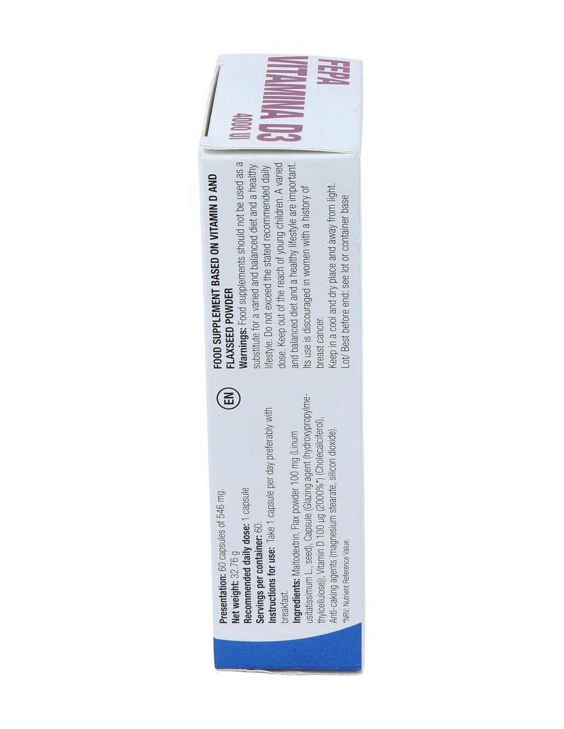Maltodextrina, Lino en polvo ((Linux usitatisimum, semillas), agente de recubrimiento (hidroxipropilmetilcelulosa), Vitamina D3 (Colecalciferol) y antiaglomerantes (sales magnésicas de ácidos grasos y dióxido de Silicio).