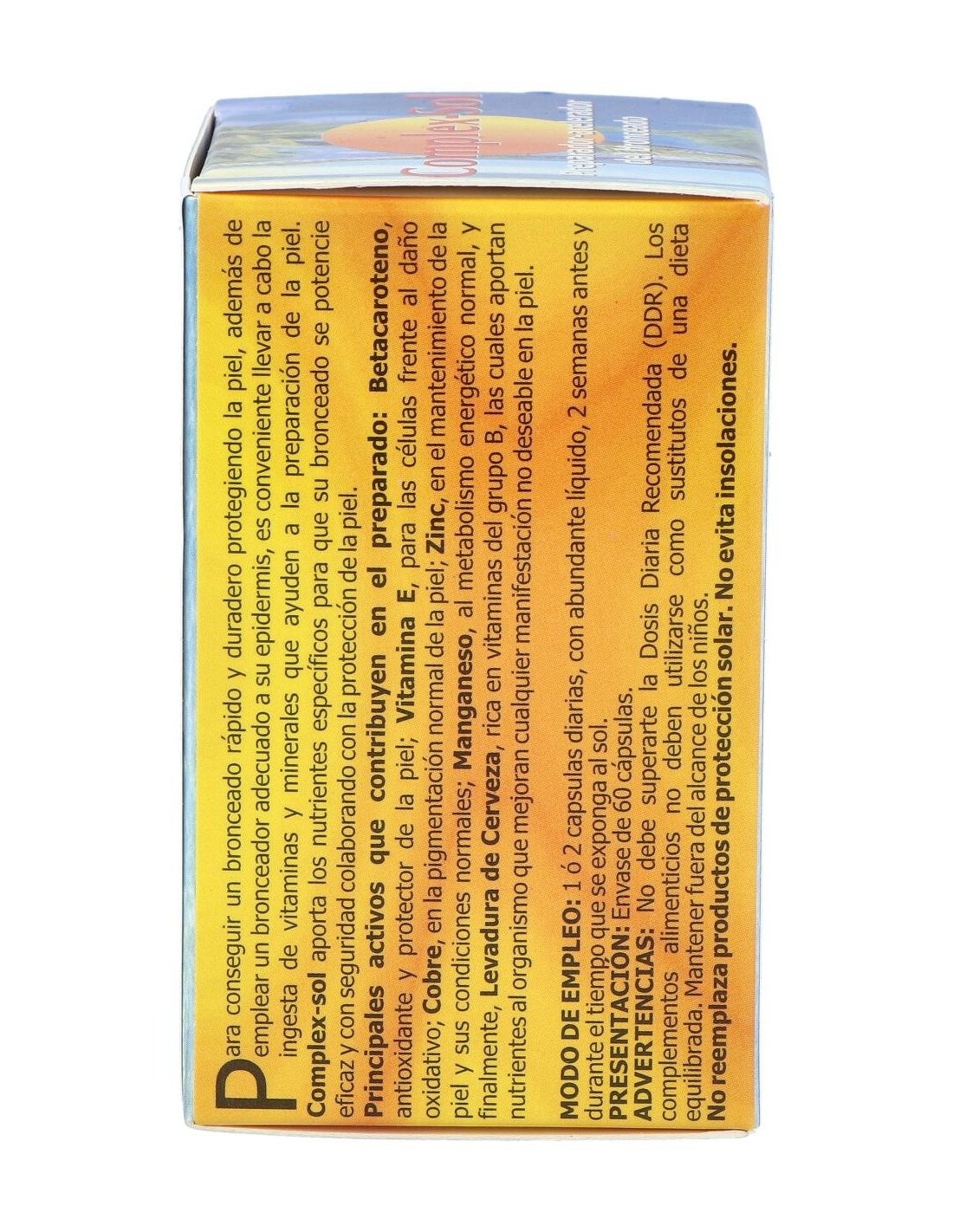 Complemento alimenticio que ayuda a estimular el bronceado y proteger la piel. Aporta vitaminas y minerales que preparan la piel para conseguir un bronceado rápido y duradero. Además de emplear un bronceador adecuado a su epidermis, se debe llevar a cabo la ingesta de vitaminas y minerales que preparen la piel. Contiene nutrientes; Betacaroteno, antioxidante, vitamina E, cobre, zinc, magnesio y levadura de cerveza. Apto para veganos. Formato de 60 cápsulas.