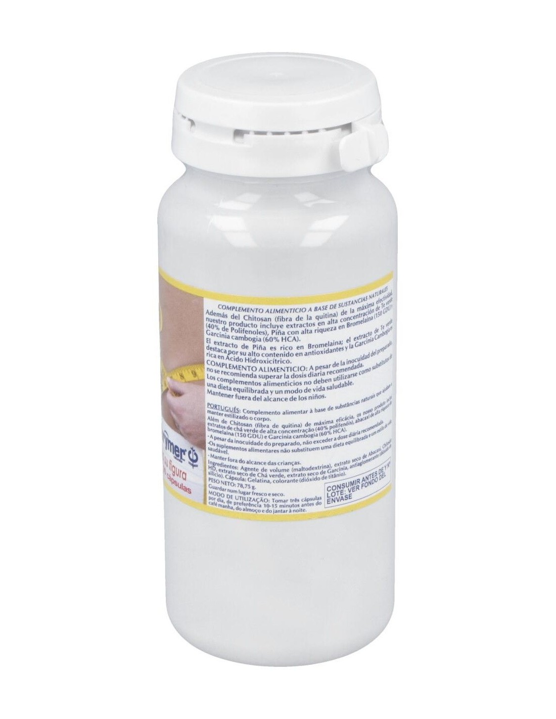 Chitosán, extractos en alta concentración de Té verde (40% de Polifenoles) , Piña con alta riqueza en Bromelina (150 GDU) y Garcinia cambogia (60% HCA).