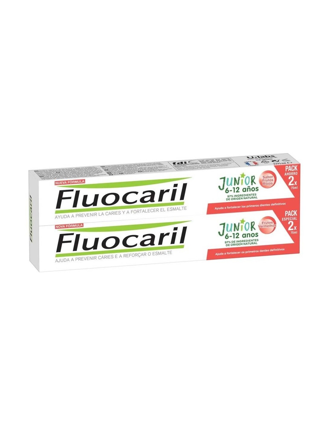 Fluocaril Duplo Pasta Junior Sabor Frutos Rojos 2x75ml es una pasta dental con flúor que ayuda a disminuir la formación de caries mientras refuerza el esmalte de los dientes. Con sabor a frutos rojos.