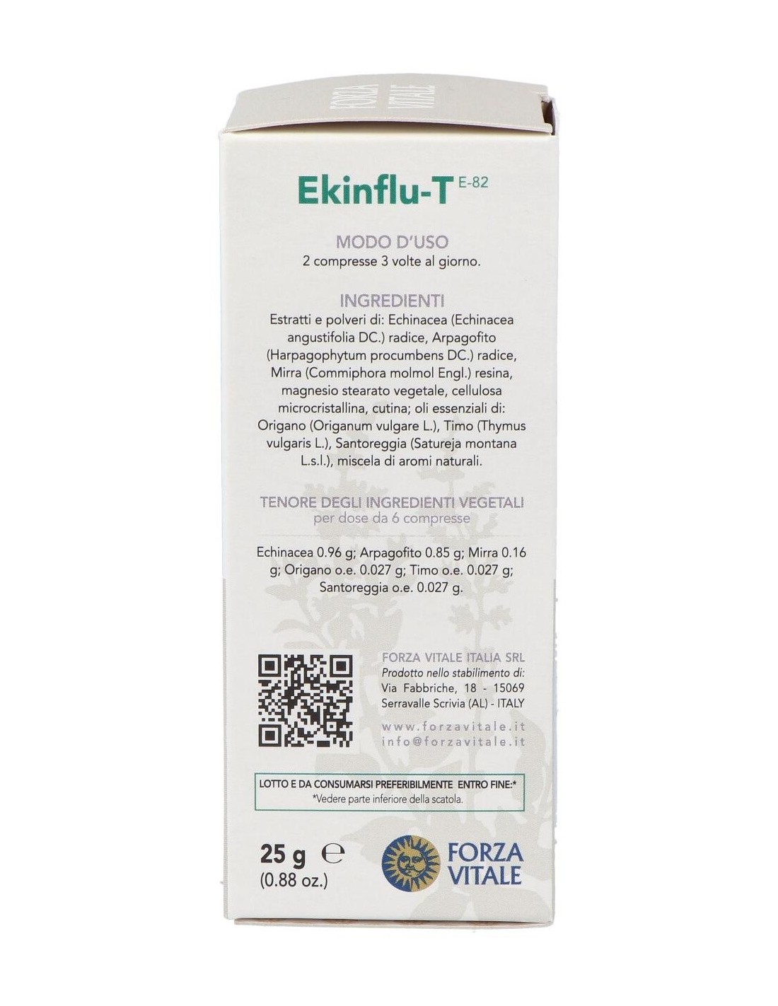Equinacea 0.96 g: Harpagofito 0.85 g: Mirra 0.16 g: Orégano 0.027 g: Tomillo 0.027 g: Ajedrea 0.027 g