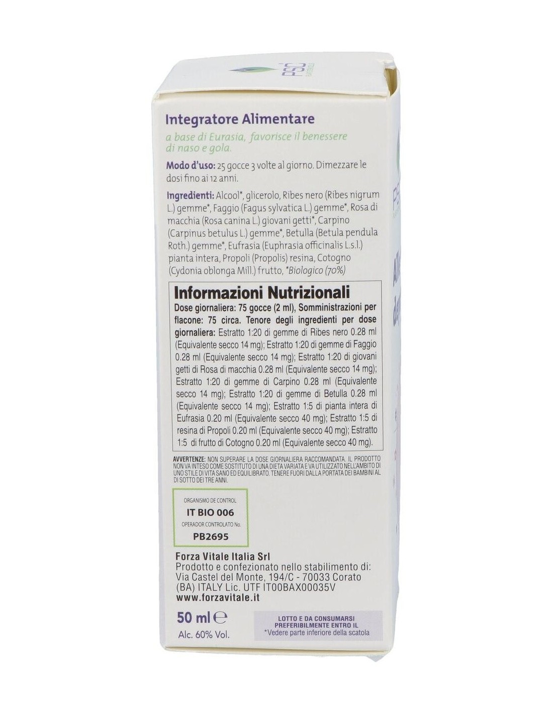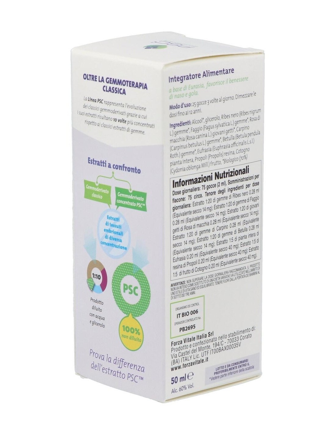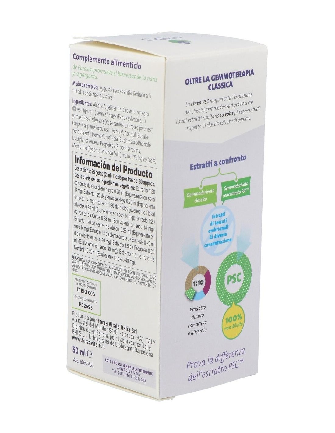 Alcohol, glicerol, Grosellero negro Bio PSC (Ribes nigrum) yemas, Haya Bio PSC* (Fagus sylvatica) yemas, Rosal silvestre Bio PSC* (Rosal silvestre) jóvenes brotes, Carpino Bio PSC* (Carpinus betulus) yemas, Abedul Bio PSC* (Betula pendula var. verrucosa) yemas, Eufrasia (Euphrasia officinalis) planta entera, Membrillo (Cydonia vulgaris) frutto, Propóleo (Propolis).
