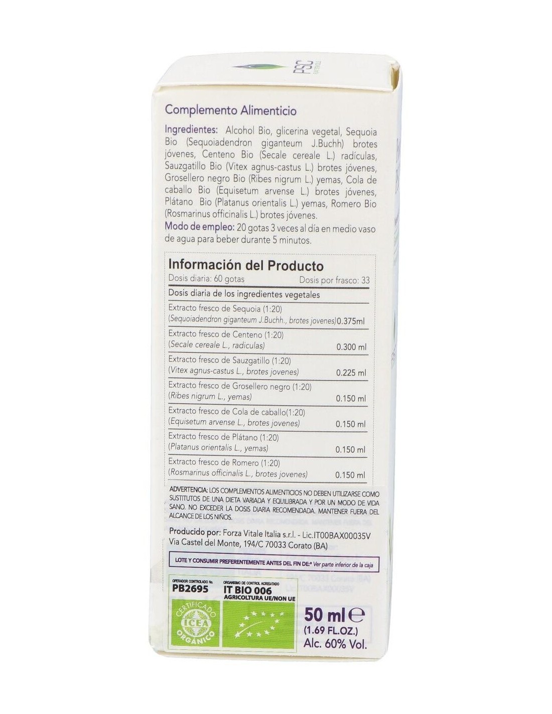 Alcohol, glicerol, Secoya Bio* (Sequoiadendron giganteum J. Buchh) brotes jóvenes, Centeno Bio* (Secale cereale L.) raízlle, Sauzgatillo Bio* (Vitex agnus-castus L.) brotes jóvenes, Grosellero negro Bio* (Ribes nigrum L.) yemas, Cola de caballo Bio* (Equisetum arvense L.) brotes jóvenes, Plátano Bio* (Platanus oritnalis L.) yemas, Romero Bio* (Rosmarinus officinalis) brotes jóvenes.