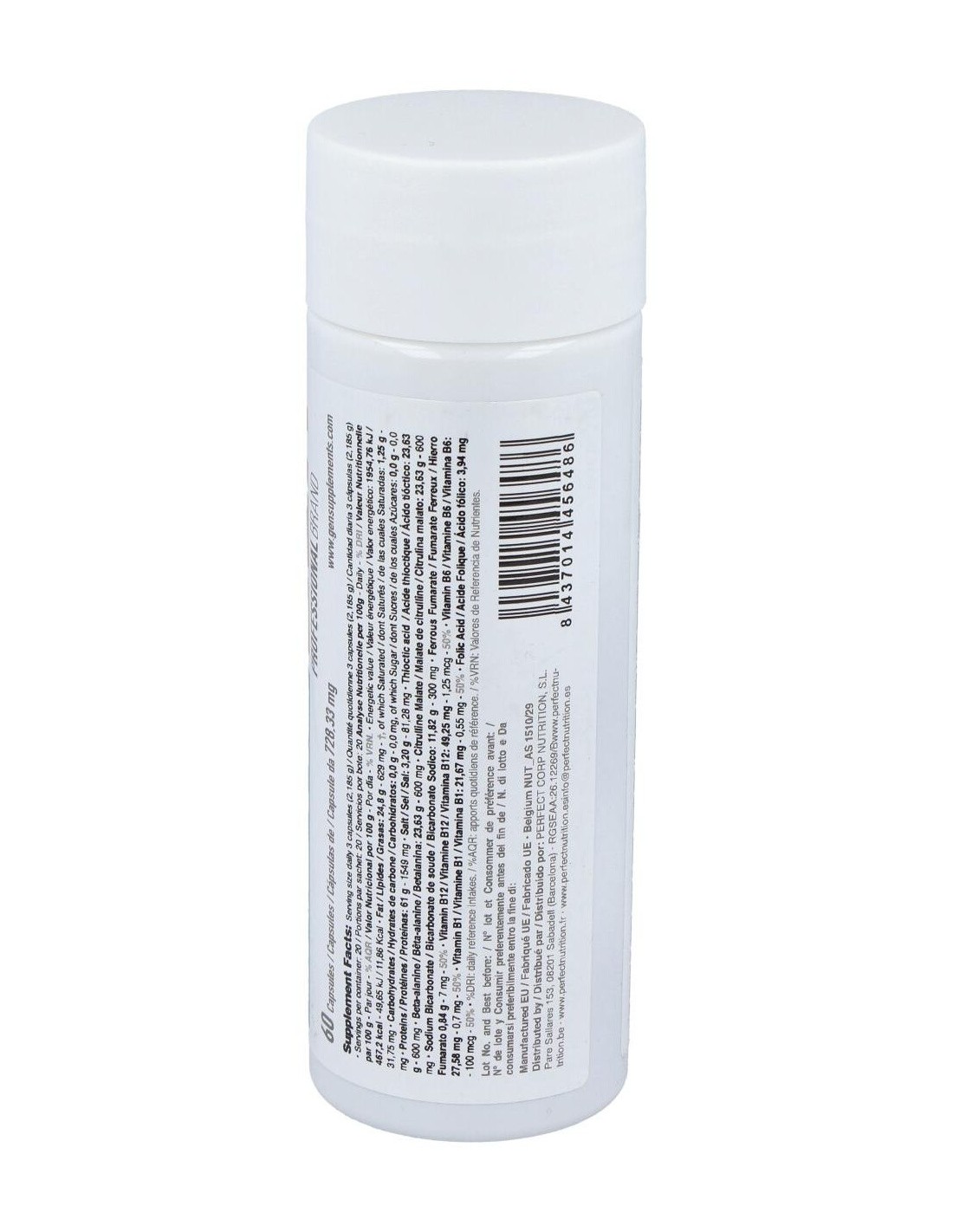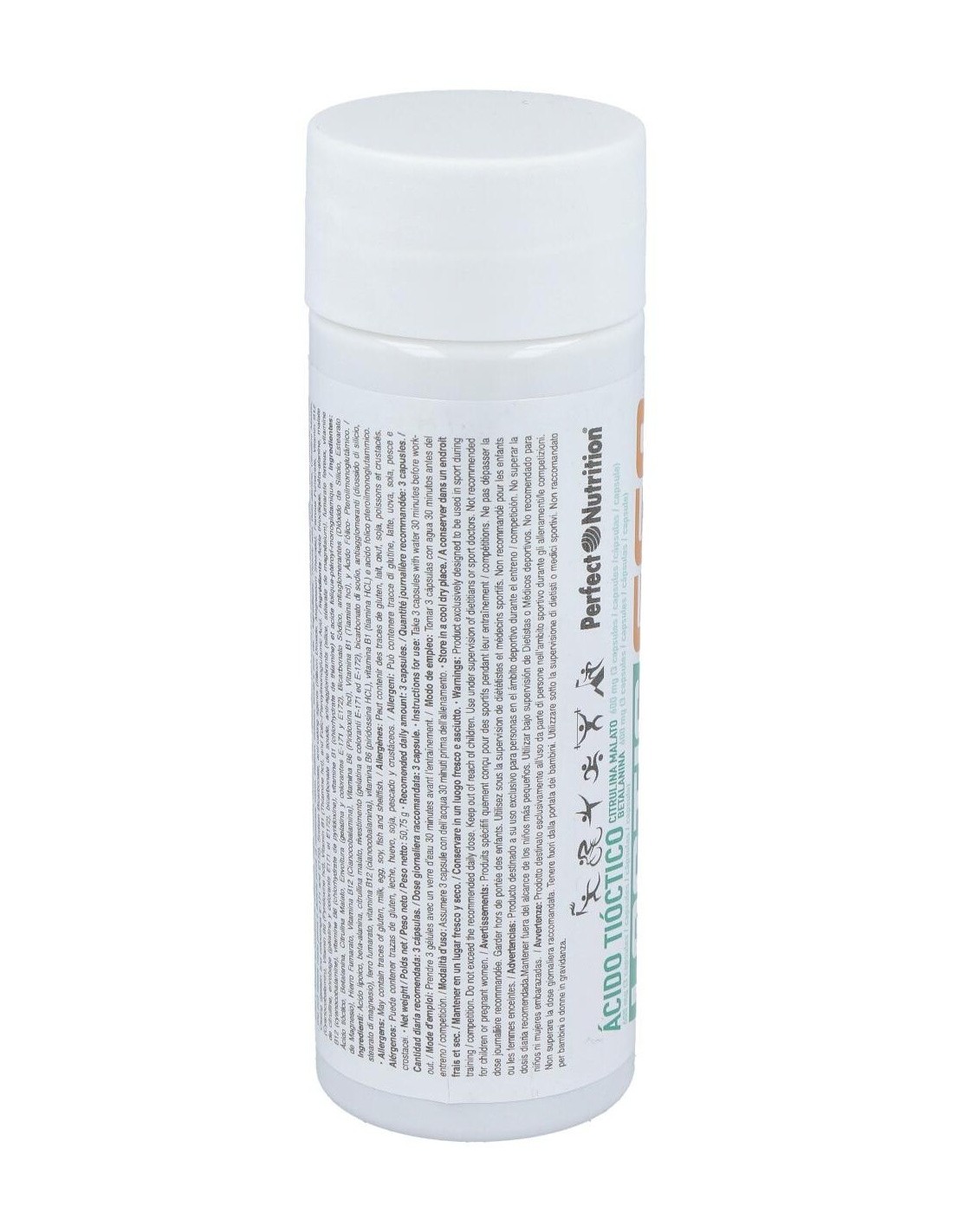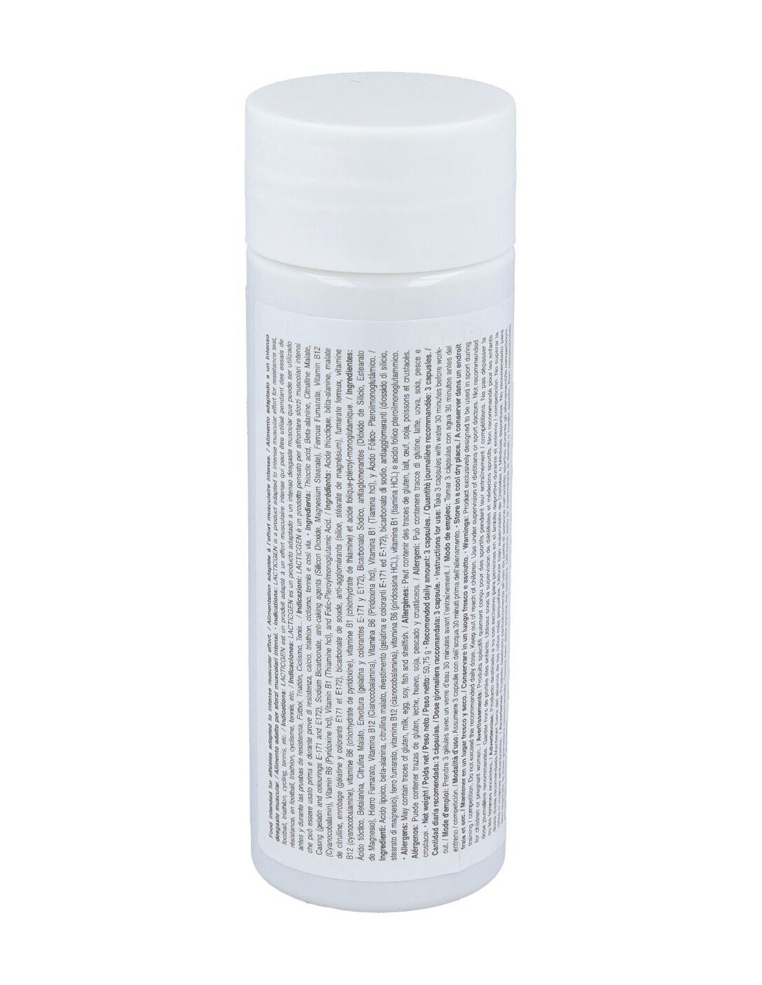 Ácido alfa lipoico, betalanina, citrulina malato, gelatina y colorante E-171 y E-172, bicarbonato sódico, magnesio estearato, hierro fumarato, dióxido de silicio, vitamina B6 (piridoxina hcl), ácido fólico, vitamina B12 (cianocobalamina)