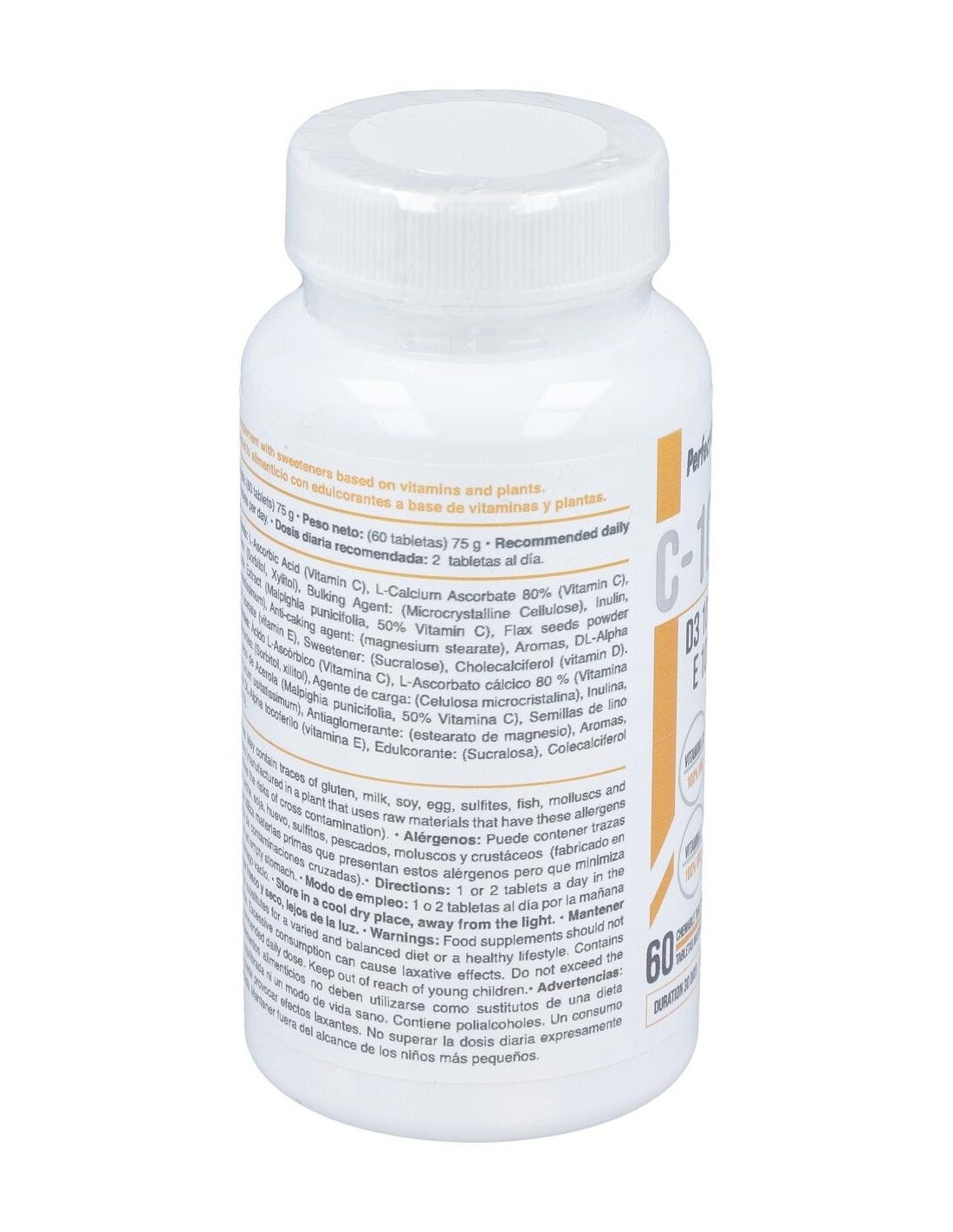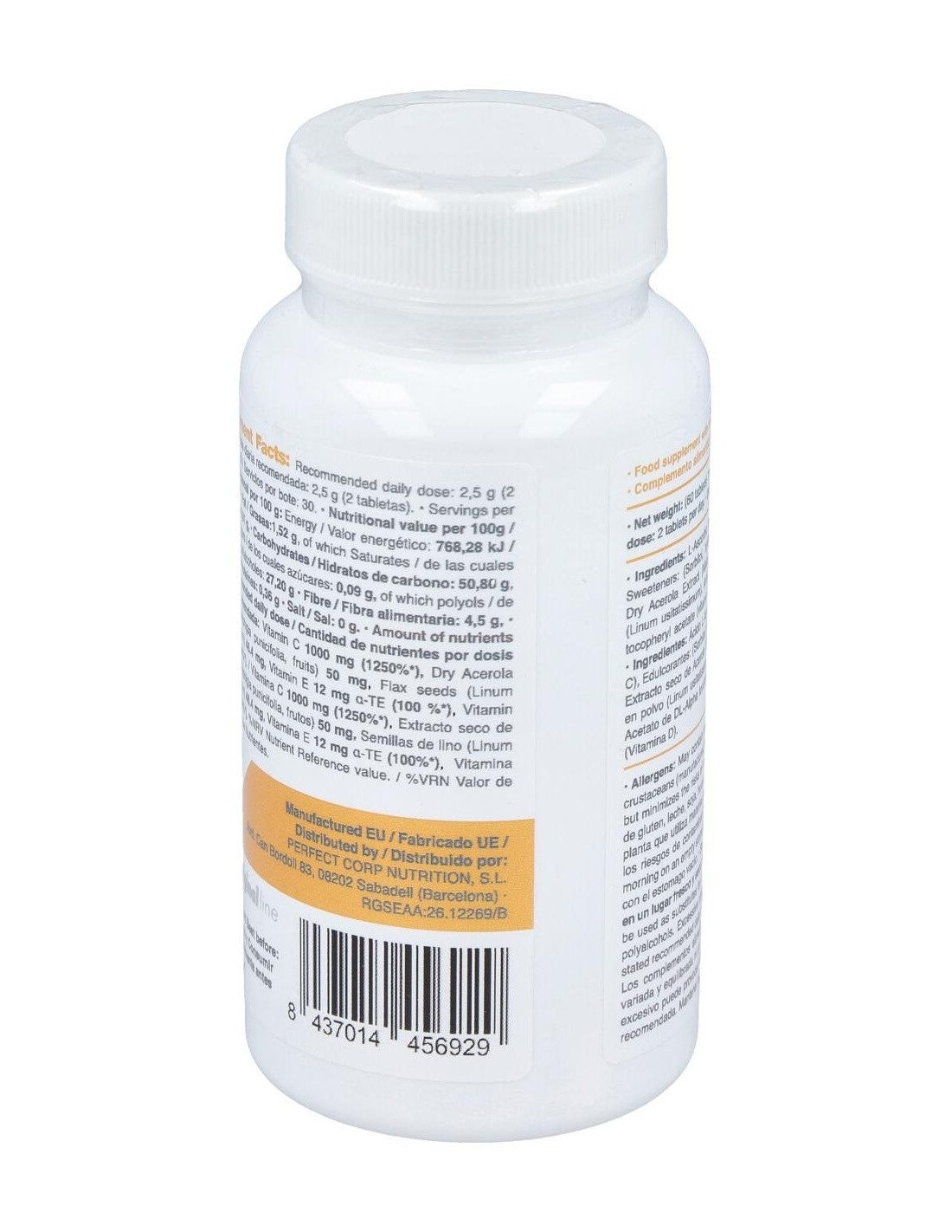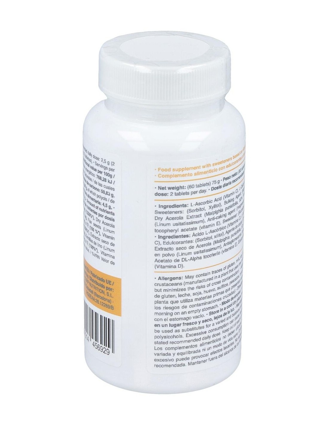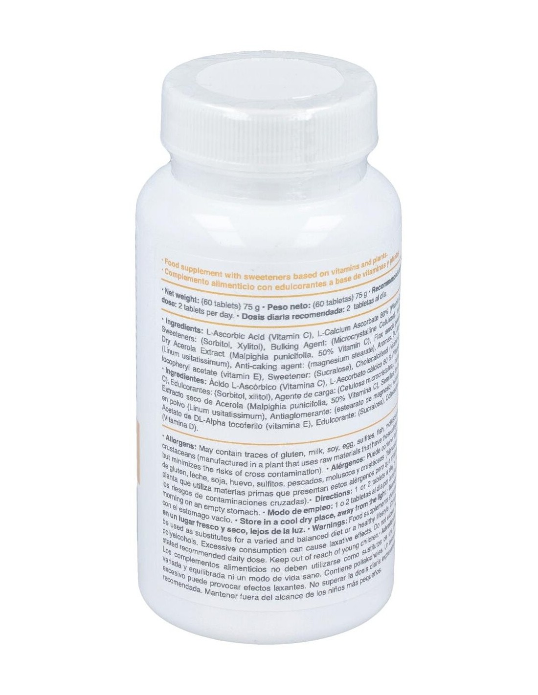 Ácido L-Ascórbico (Vitamina C), L-Ascorbato cálcico 80 % (Vitamina C), Edulcorantes: (Sorbitol, xilitol), Agente de carga: (Celulosa microcristalina), Inulina, Extracto seco de Acerola (Malpighia punicifolia, 50% Vitamina C), Semillas de lino en polvo (Linum usitatissimum), Antiaglomerante: (estearato de magnesio), Aromas, Acetato de DL Alpha tocoferilo (vitamina E), Edulcorante: (Sucralosa), Colecalciferol (Vitamina D)