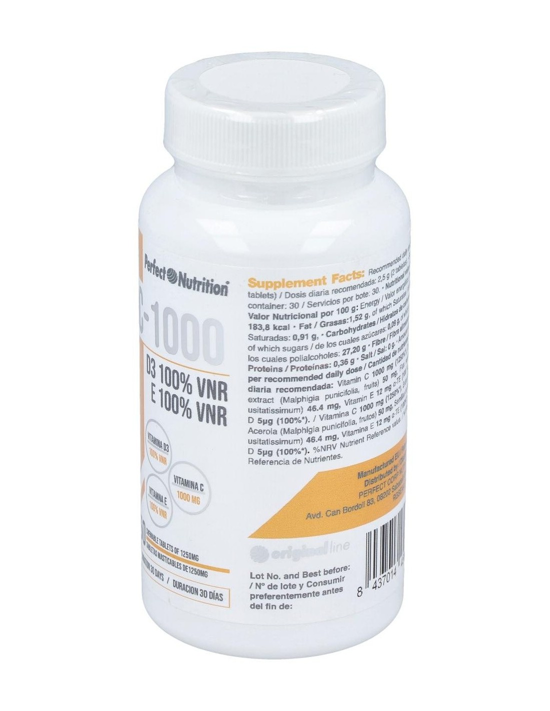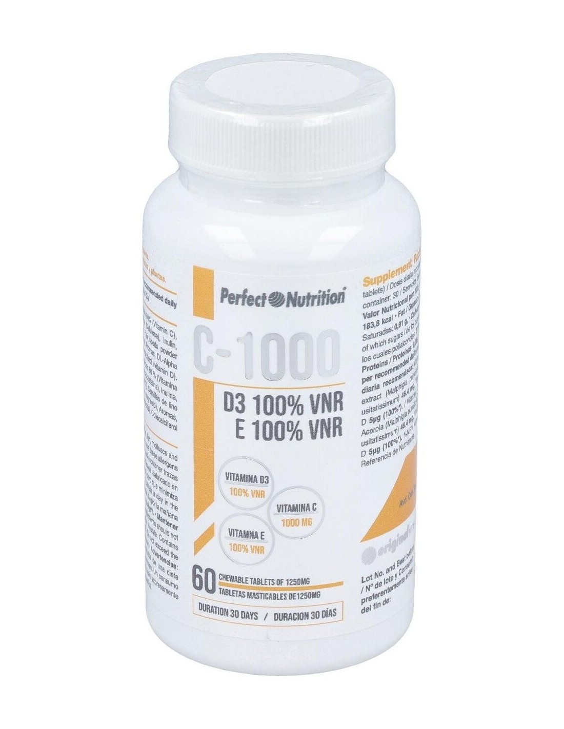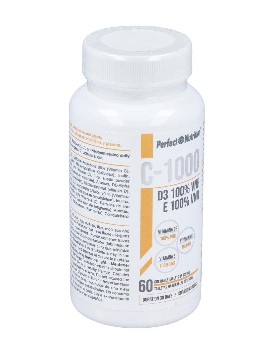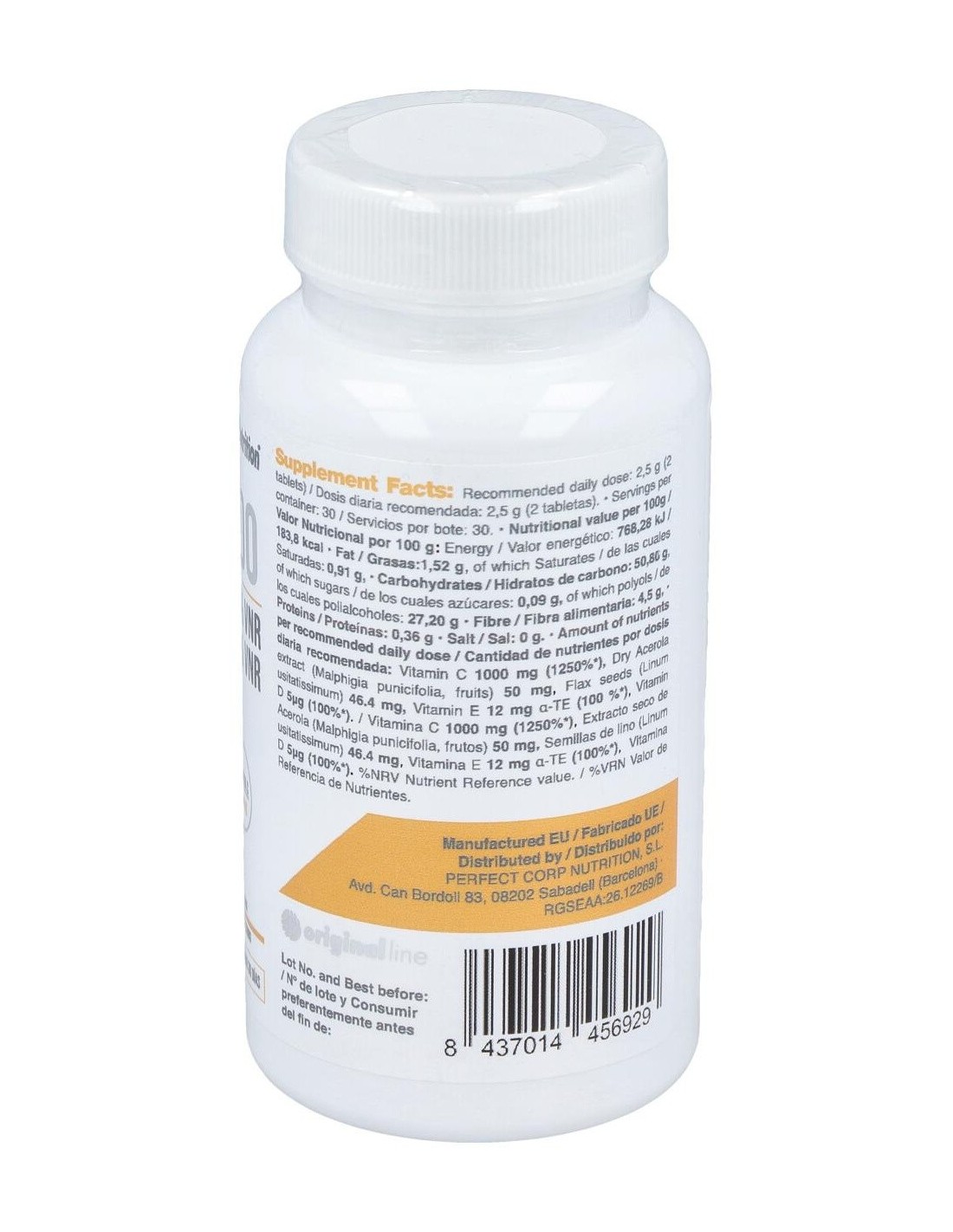 Ácido L-Ascórbico (Vitamina C), L-Ascorbato cálcico 80 % (Vitamina C), Edulcorantes: (Sorbitol, xilitol), Agente de carga: (Celulosa microcristalina), Inulina, Extracto seco de Acerola (Malpighia punicifolia, 50% Vitamina C), Semillas de lino en polvo (Linum usitatissimum), Antiaglomerante: (estearato de magnesio), Aromas, Acetato de DL Alpha tocoferilo (vitamina E), Edulcorante: (Sucralosa), Colecalciferol (Vitamina D)