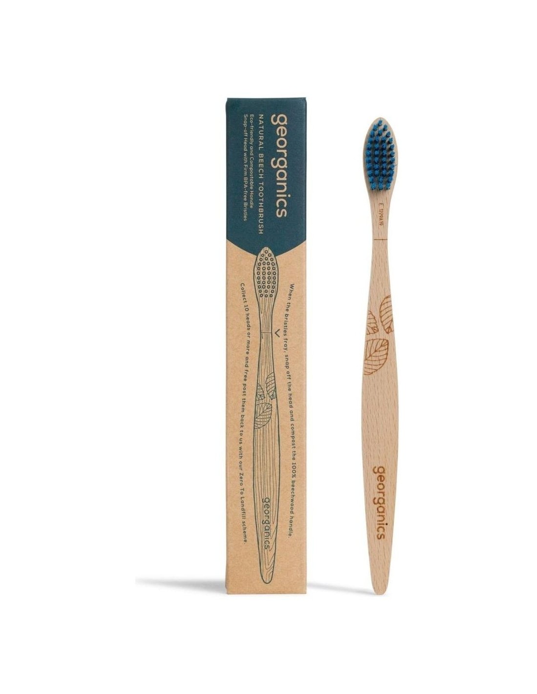 Cepillo de dientes manual hecho de madera de haya sostenible, procedente de bosques certificados por FSC, en los Alpes suizos. Por cada árbol cortado, se replanta uno nuevo y el material sobrante del tallado de los mangos se utiliza para calentar la fábrica. Las cerdas de alta calidad se fabrican en Alemania con nailon sin BPA. Estas cerdas firmes de nailon sin BPA eliminan eficazmente la acumulación de placa y sarro.