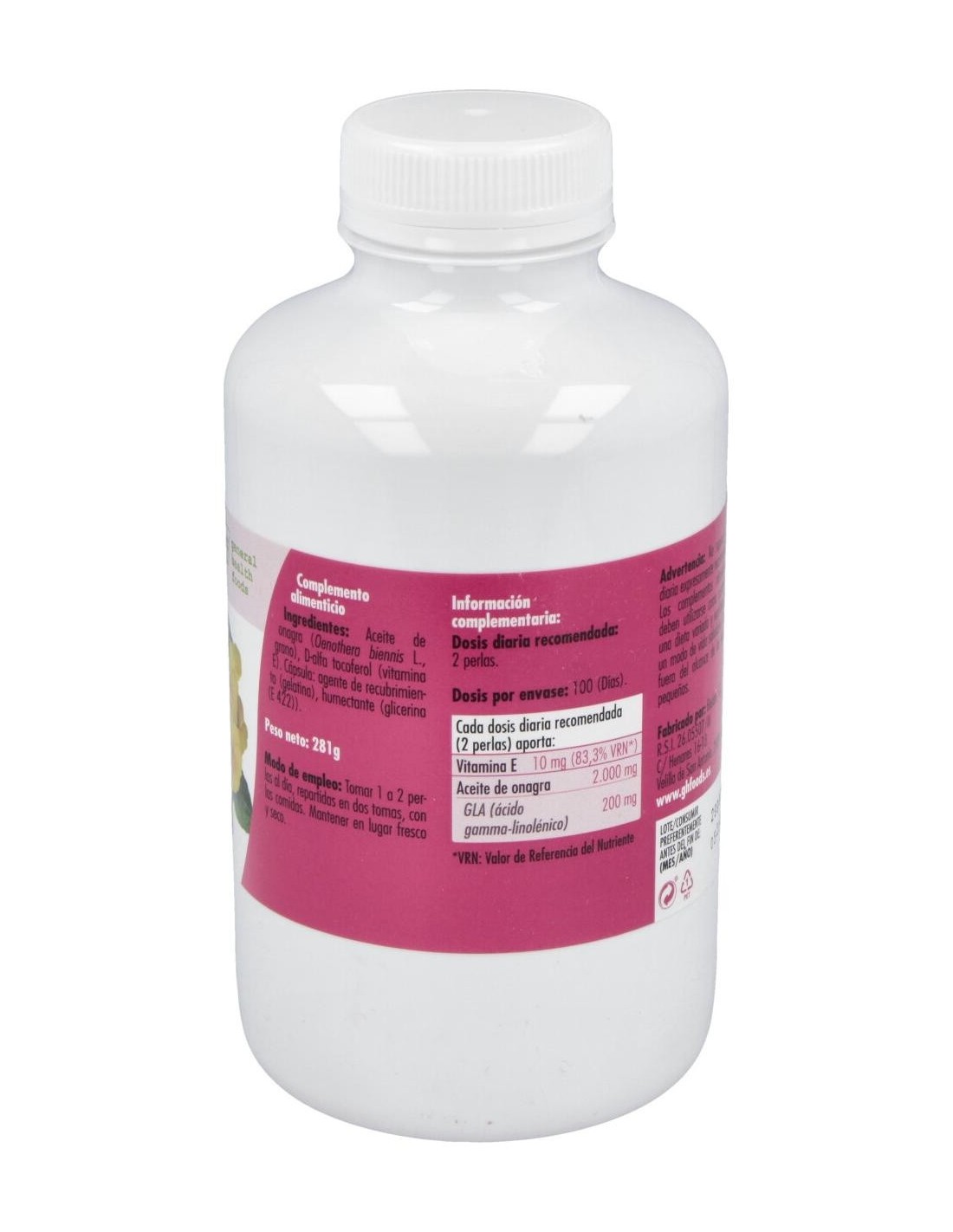 El contenido de aceite de Onagra de primera presión en frío con min, es de 1000mg 10% GLA, 5mg de vitamina E natural, d-alfa tocoferol acetato (50% CDR). Cobertura de gelatina y glicerina. Peso total aproximado de la cápsula es de 1400mg (incluida cobertura)
