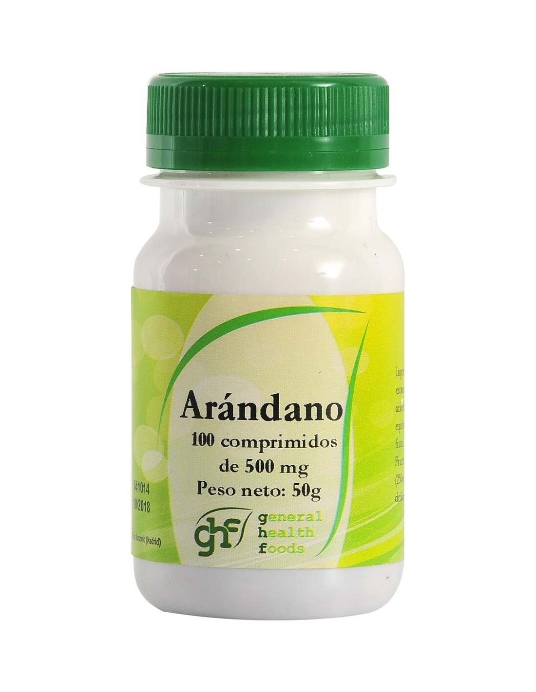 GHF Mirtilo 500mg 100 comp complemento alimenticio a base de Arándono Rojo muy rico en Vitamina C y Polifenoles antioxidantes. Tiene una alta acción bactericida a nivel digestivo. También protege de las infecciones urinarias y ayuda a combatir los radicales libres.