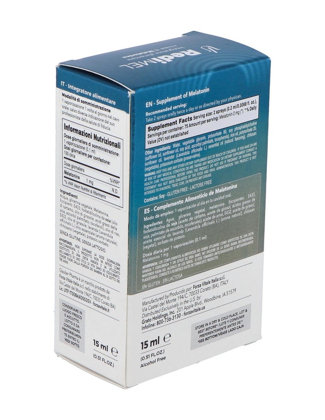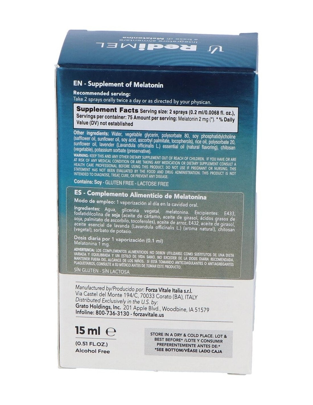 Agua, glicerina vegetal, melatonina. Excipientes: E433, fosfatidilcolina de soja (aceite de cártamo, aceite de girasol, ácidos grasos de soja, palmitato de ascorbilo, tocoferoles), aceite de arroz, E432, aceite de girasol, aceite esencial de lavanda (Lavandula officinalis L.) (aroma natural), chitosán (vegetal), sorbato de potasio.