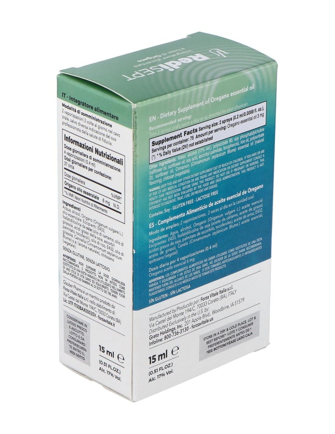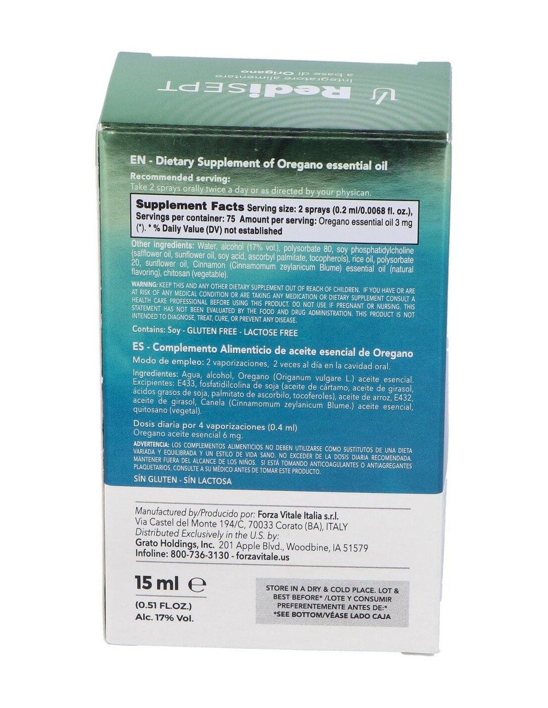 Agua, alcohol, Orégano (Origanum vulgare L.) aceite esencial. Excipientes: E433, fosfatidilcolina de soja (aceite de cártamo, aceite de girasol, ácidos grasos de soja, palmitato de ascorbilo, tocoferoles), aceite de arroz, E432, aceite de girasol, Canela (Cinnamomum zeylanicum Blume.) aceite esencial, quitosano (vegetal).