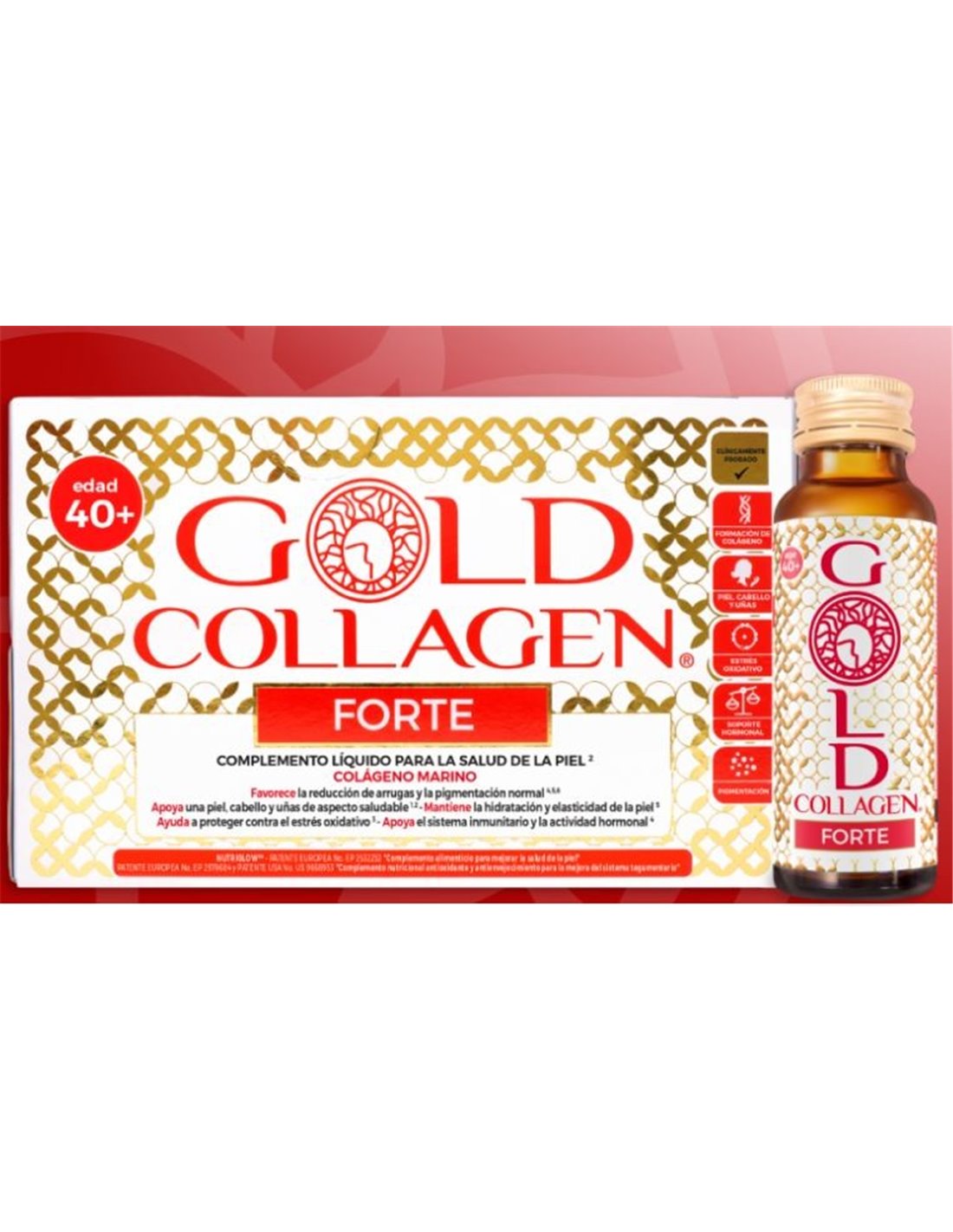 Gold Collagen Forte 10x50ml es un nutricosmético indicado para mujeres a partir de los 40 años que contribuyen a reforzar piel, cabello, uñas, apoya el equilibrio hormonal, la salud de articulaciones y el sistema inmune.
