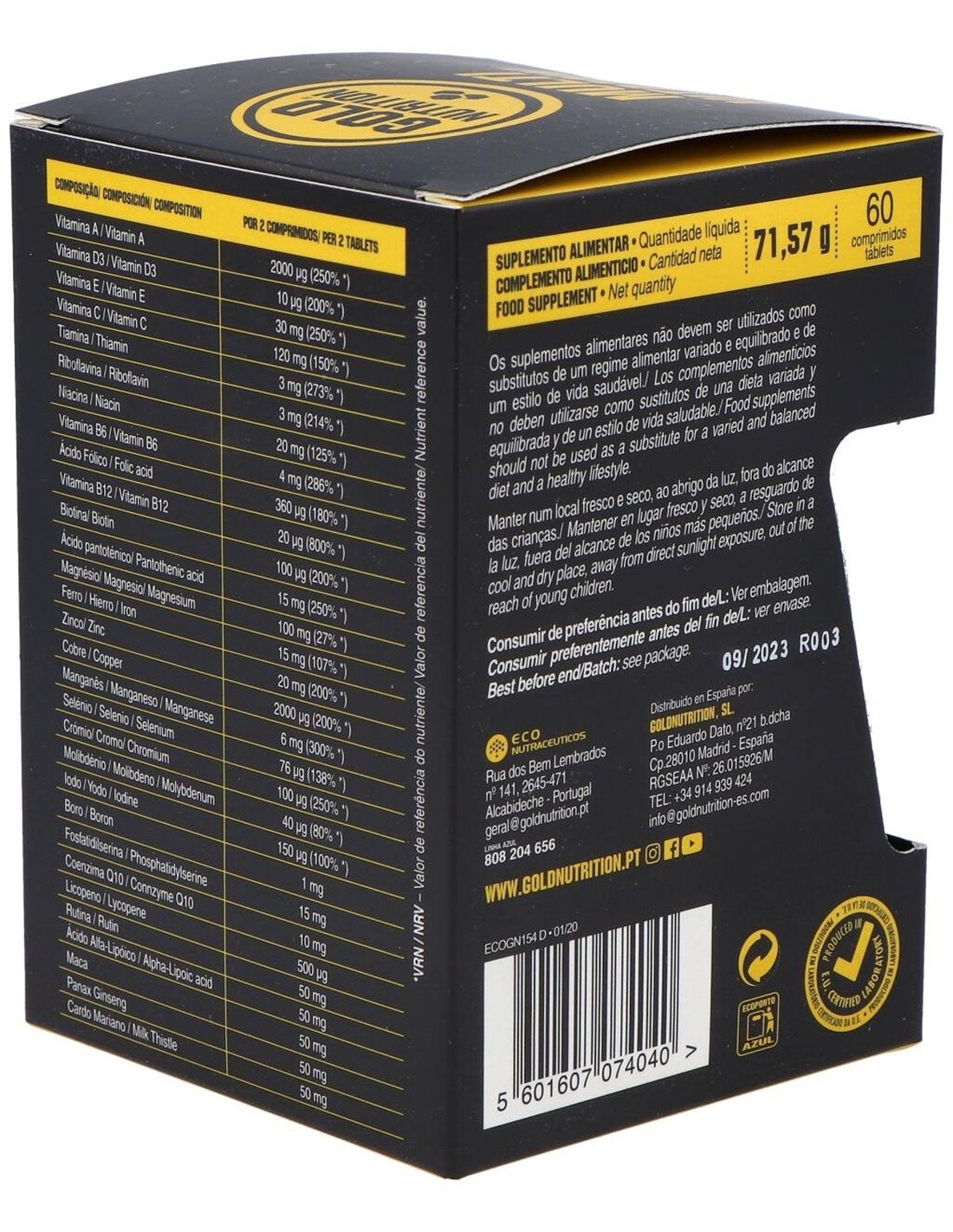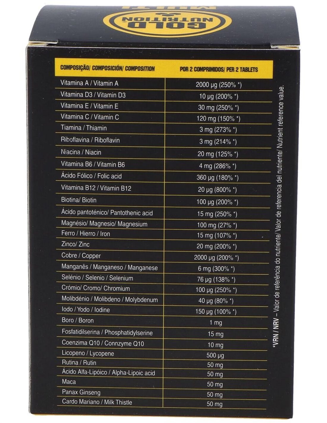 Agente De Carga (Celulosa Microcristalina), Citrato De Calcio, Óxido De Magnesio, Citrato De Potasio, Gluconato De Ferroso, Ácido L-Ascórbico, Citrato De Zinc, Extracto De Raíz De Maca 4:1 (Lepidium Meyenii), Extracto De Raíz De Panax Ginseng, Extracto De Cardo Mariano (Silybum Marianum, Semillas), Licopeno, Ácido Alfa-Lipoico, Rutina, Levadura Enriquecida Con Selenio, Acetato De D-Alfa Tocoferilo, Antiaglomerantes (Estearato De Magnesio, Dióxido De Silicio), Fosfatidilserina (Soja), Citrato De Manganeso, Nicotinamida, D-Pantotenato Cálcico, Ubiquinona, Sulfato Cúprico, Borato Sódico, Clorhidrato De Piridoxina, Clorhidrato De Tiamina, Riboflavina, Acetato De Retinilo, Picolinato De Cromo, Ácido Pteroilmonoglutámico, Yoduro De Potasio, D-Biotina, Molibdato De Sodio, Cianocobalamina, Colecalciferol.