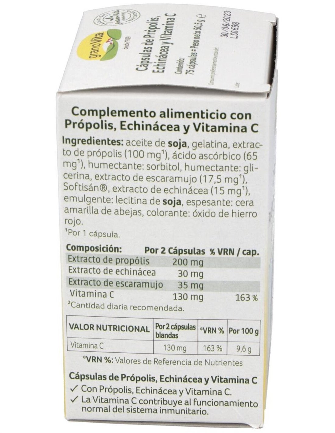 Extracto de propóleo 100 mg, vitamina C (ácido ascórbico) 75 mg (2 cápsulas proporcionan 150 mg, es decir el 245% de la C.D.R., cantidad diaria recomendada), extractos de plantas: extracto de escaramujo (rosa canina fructus) 50 mg, echinácea pallida, radix) 25 mg, aceite de soja, emulsionante lecitina soja, recubrimiento (gelatina, estabilizadores: glicerol, glucitol, óxido de Hierro).