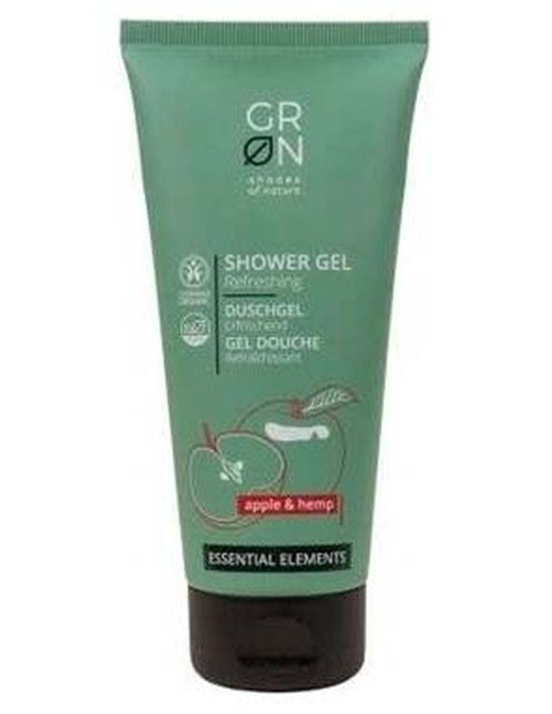 Gel de ducha refrescante con extracto de manzana y aceite protector de semillas de cáñamo, fragancia afrutada de manzana, limpia la piel suavemente. Fórmula vegana. Producto certificado Cosmos Organic.