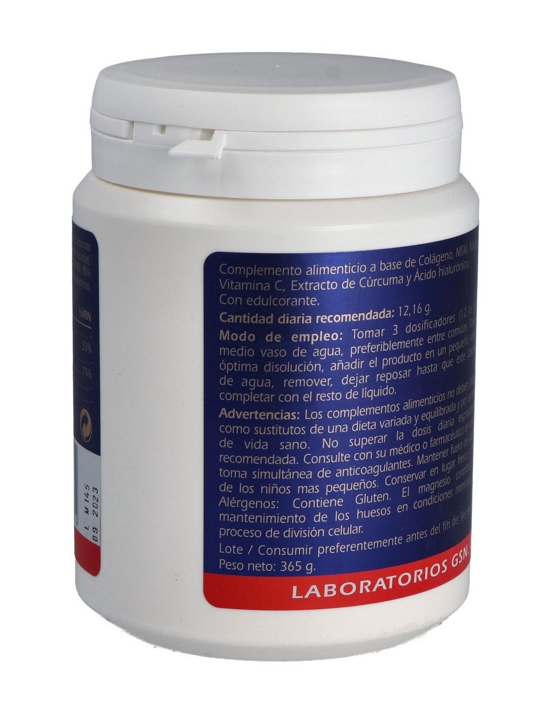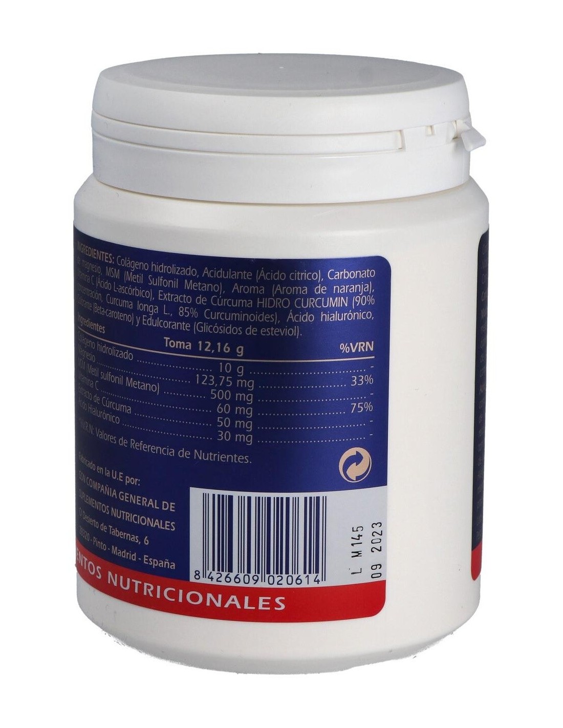 Colágeno hidrolizado, Acidulante (Ácido cítrico), Carbonato de magnesio, MSM (Metil Sulfonil Metano), Aroma (Aroma de Naranja), Vitamina C (Ácido L-ascórbico), Extracto de Cúrcuma HIDRO CURCUMIN (90%concentración, Cúrcuma longa L, 85% Curcuminoides), Ácido Hialurónico, Colorante (Beta-caroteno) y Edulcorante (Glicósidos de esteviol).