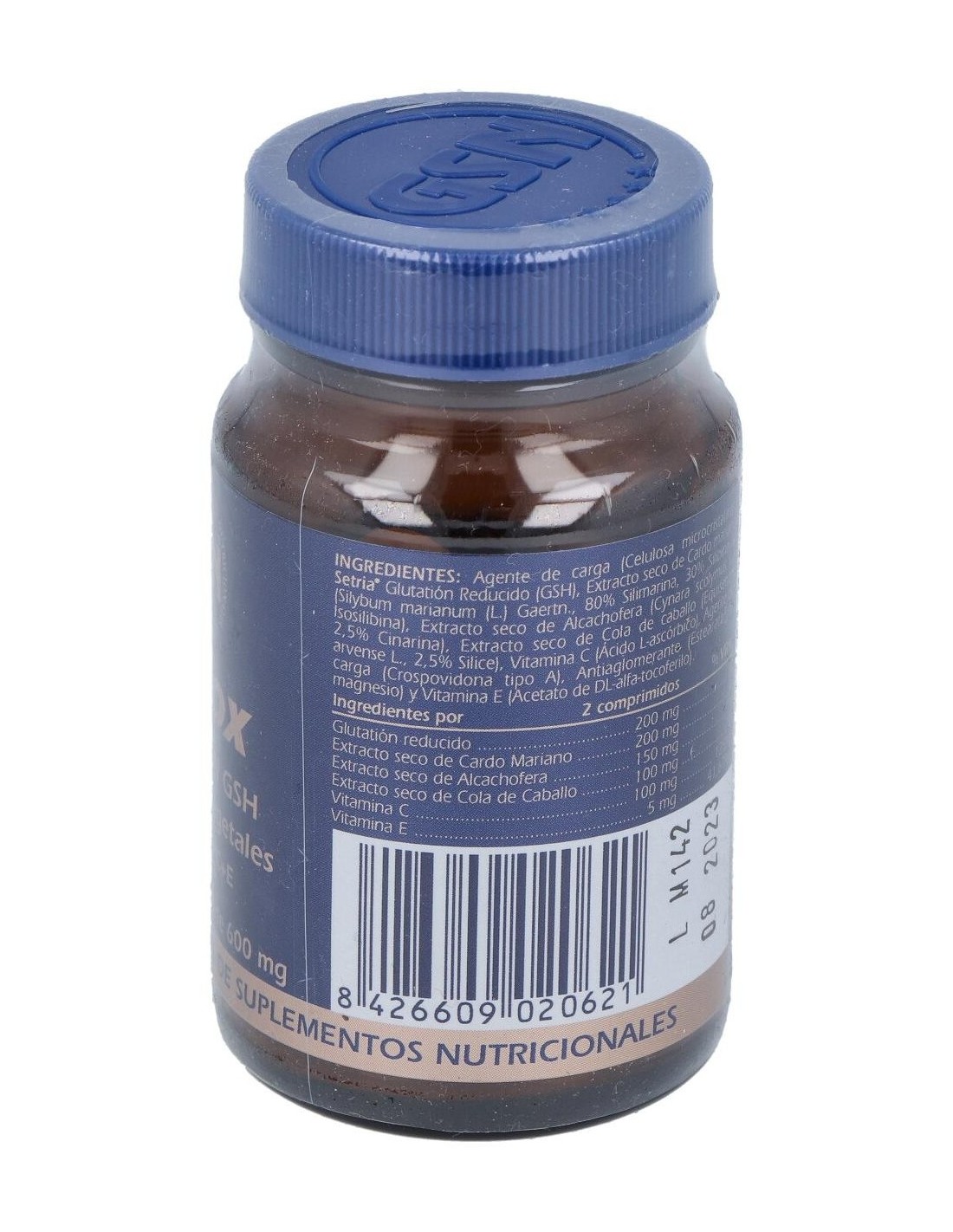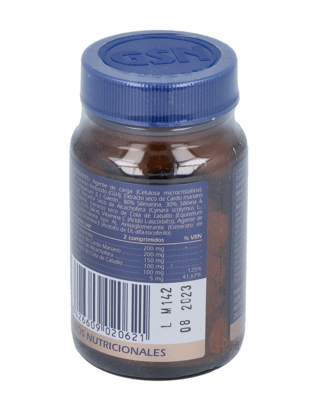 Glutation Reducido (GSH), Extracto seco de Cardo mariano (80% Silimarina, 30% Silibina & Isosilibina), Extracto seco de Alcachofera ( 2,5% Cinarina), Extracto seco de Cola de caballo (2,5% Silice), Vitamina C (Ácido L-ascórbico) y Vitamina E (Acetato de DL-alfa-tocoferilo).