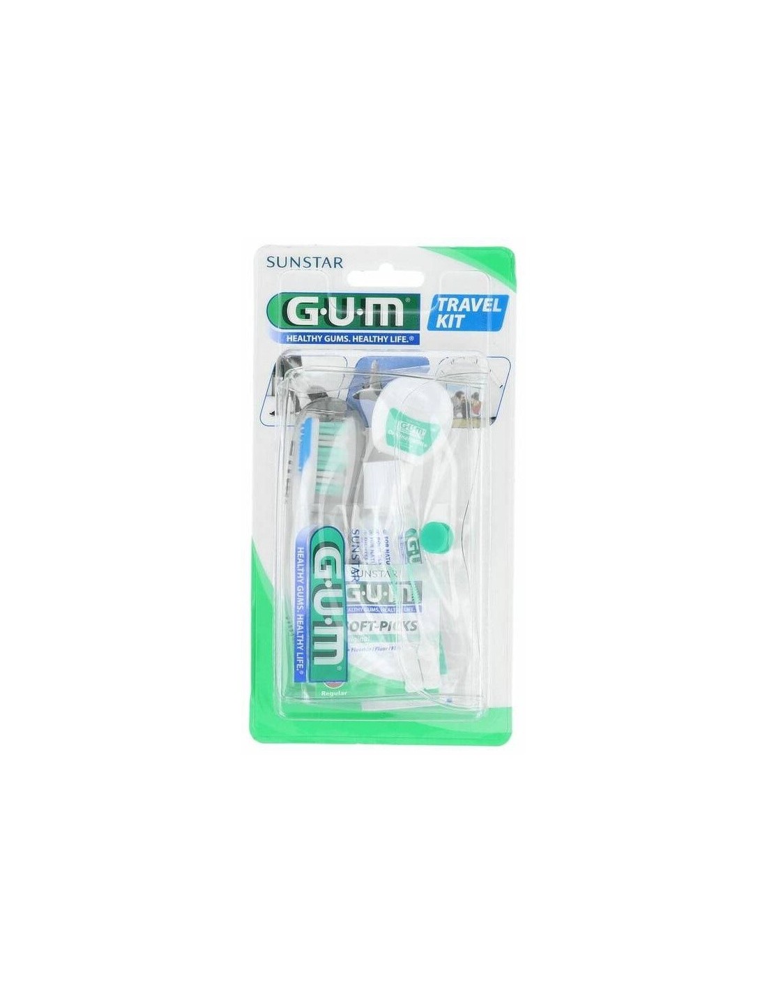 Contiene:\ - Cepillo de dientes de viaje GUM con filamentos antibacterianos protegidos para mayor higiene.\ - Pasta de dientes GUM Original White para unos dientes naturalmente blancos.\ - Hilo dental GUM Original White: un hilo dental fácil de usar que ayuda a eliminar las manchas entre los dientes.\ - Un paquete con dos palillos interdentales GUM SOFT-PICKS® ORIGINAL: estos palillos interdentales desechables eliminan la placa entre los dientes de forma segura y suave.