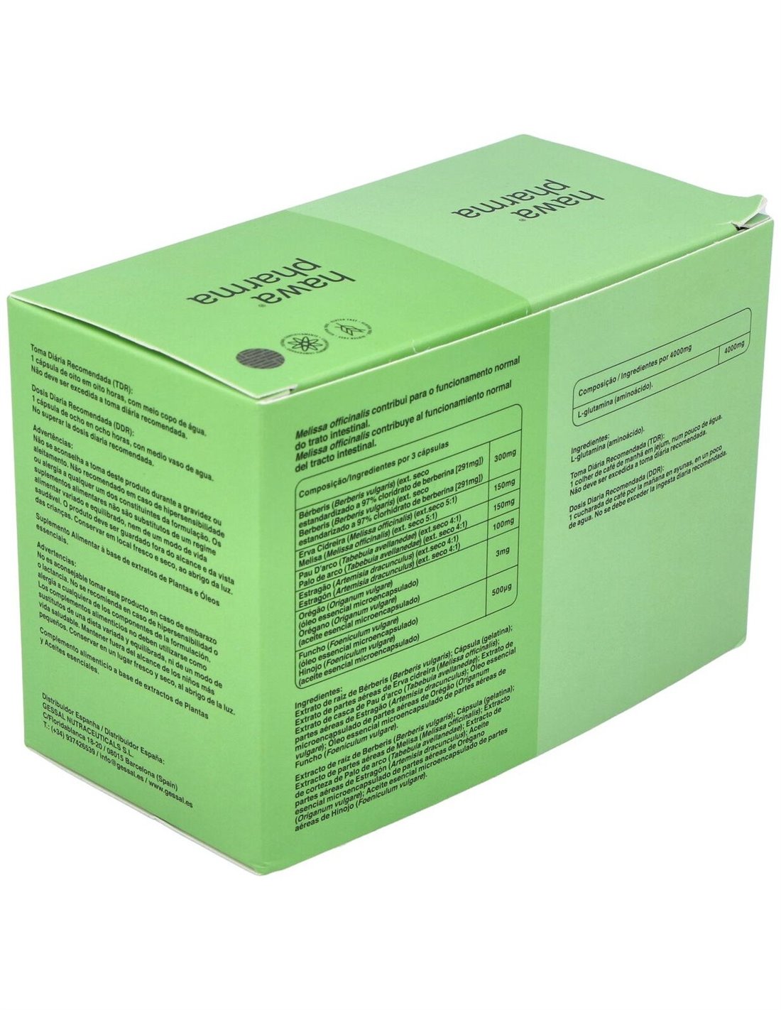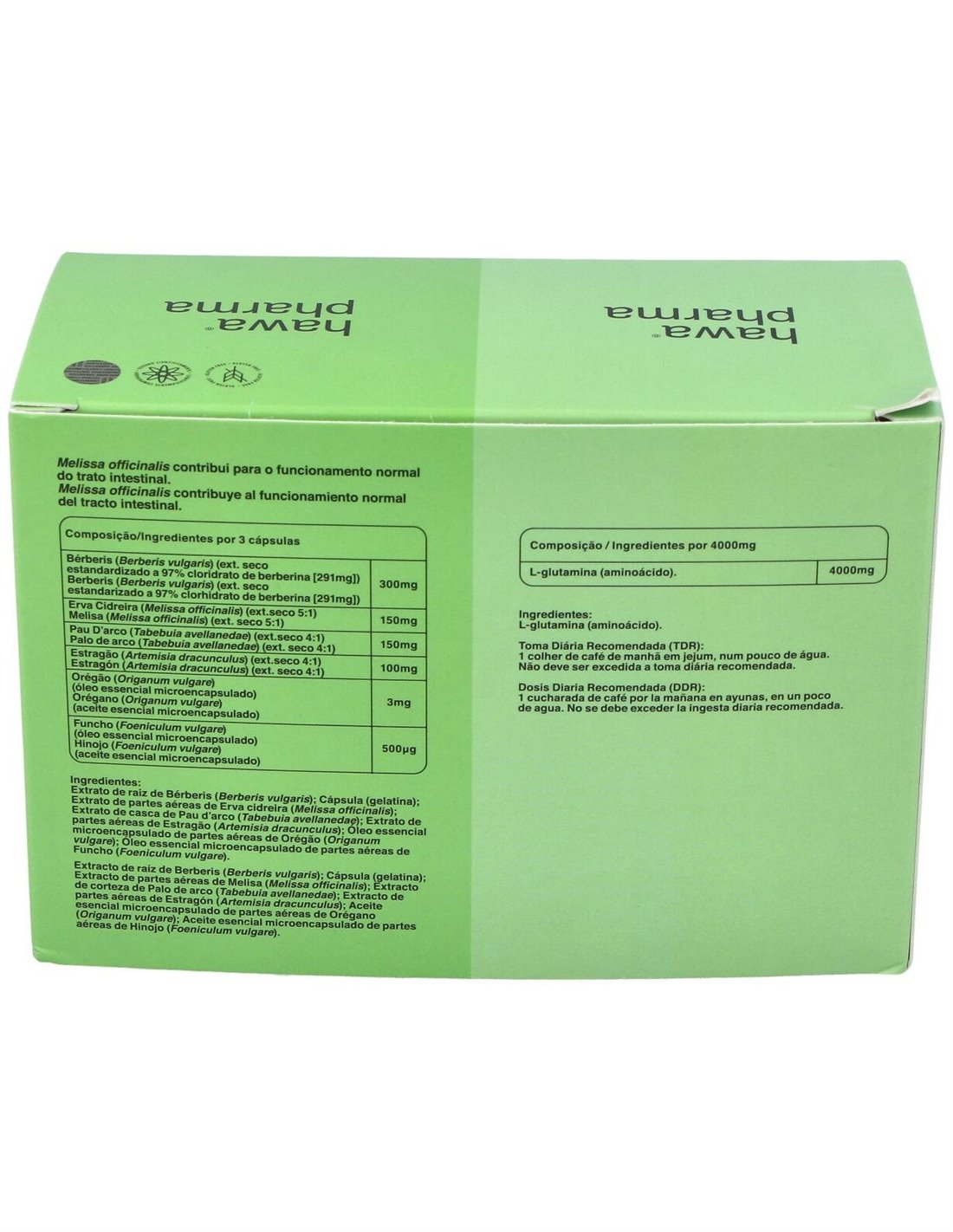 SIBO cápsulas: Extracto de raíz de Berberis (Berberis vulgaris): Cápsula (gelatina): Extracto de partes aéreas de Melisa (Melissa officinalis): Extracto de corteza de Palo de arco (Tabebuia avellanedae): Extracto de partes aéreas de Estragón (Artemisia dracunculus): Aceite esencial microencapsulado de partes aéreas de Orégano (Origanum vulgare): Aceite esencial microencapsulado de partes aéreas de Hinojo (Foeniculum vulgare).