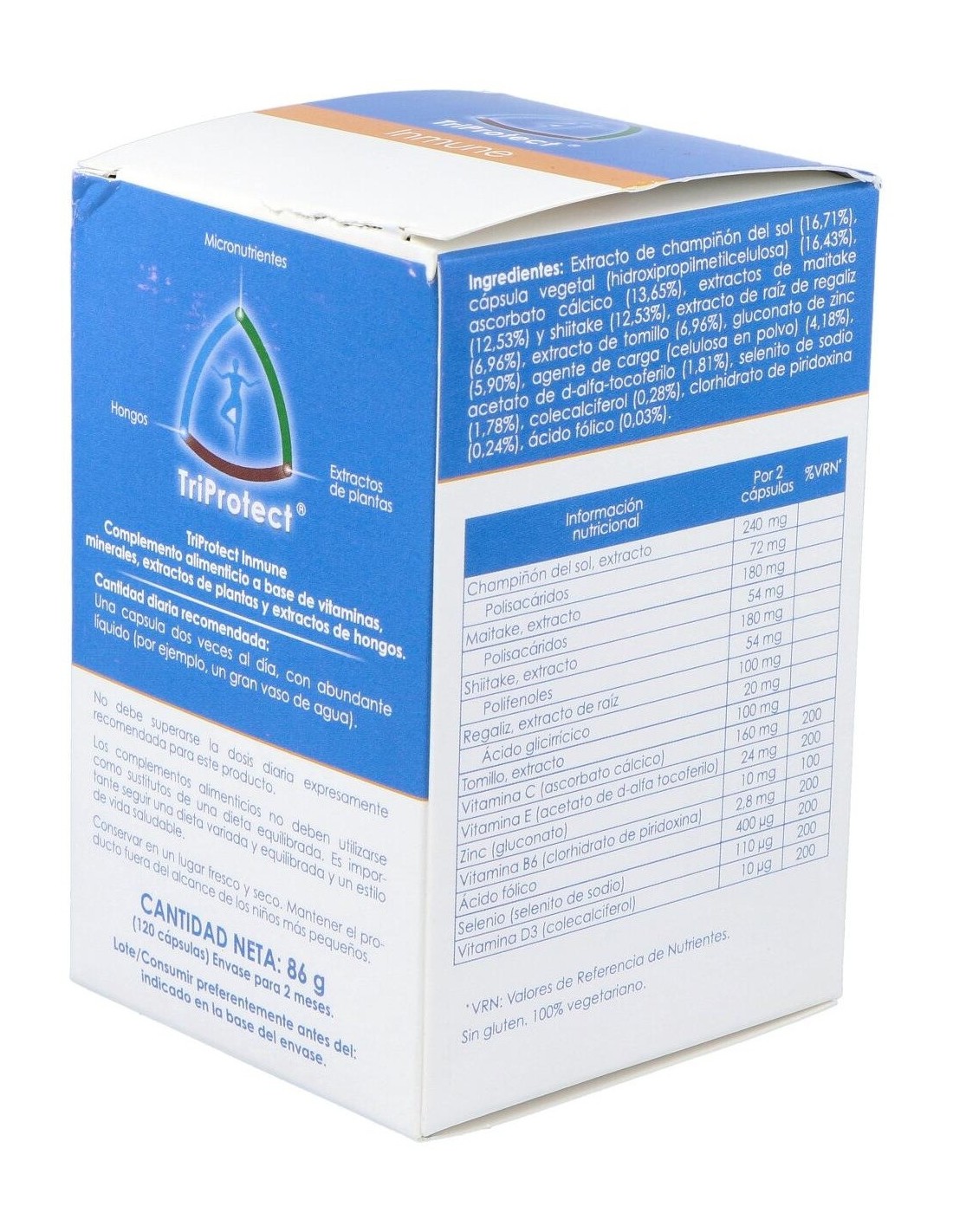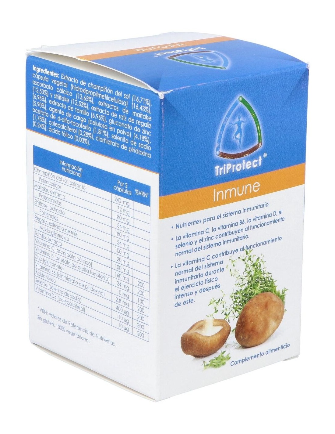 Champiñón del sol (Agaricus blazei) extracto, Contenido en polisacáridos, Maitake (Grifola frondosa) extracto, Contenido en polisacáridos, Shiitake (Lentinula edodes) extracto, Contenido en polisacáridos, Regaliz (Glycyrrhiza glabra) extracto de raíz, Contenido en ácido glicirrícico, Tomillo (Thymus vulgaris) extracto de hoja, Vitamina C (ascorbato cálcico), Vitamina E (acetato de d-alfa tocoferol), Zinc (gluconato), Vitamina B6 (clorhidrato de piridoxina), Ácido fólico, Selenio (selenito de sodio), Vitamina D3 (colecalciferol). Cápsula vegetal (hidroxipropilmetilcelulosa), agente de carga (celulosa en polvo).