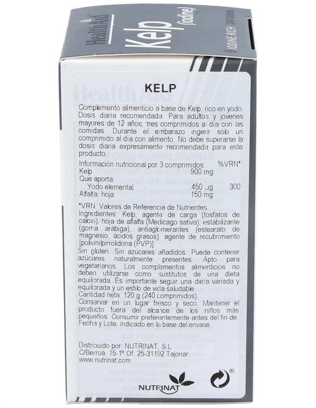 Suplemento nutricional a base de kelp, rico en yodo. El yodo contribuye a la producción normal de hormonas tiroideas y a la función tiroidea normal, al funcionamiento normal del sistema nervioso y al mantenimiento de la piel en condiciones normales, a la función cognitiva y al metabolismo energético normal. Apto para vegetarianos.
