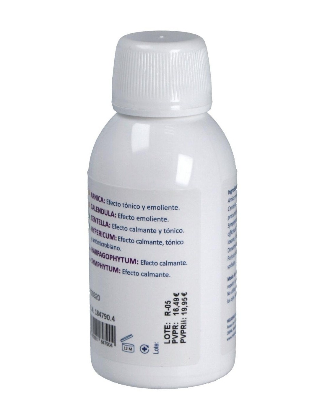Arnica montana, Calendula officinalis, Centella asiatica, Harpagophytum procumbens, Hypericum perforatum, Symphytum officinale, aqua, cyclopentasiloxane, sodium acrylate, crosspolymer, isohexadecane, polysorbate-60, sodium benzoate, potassium sorbate.
