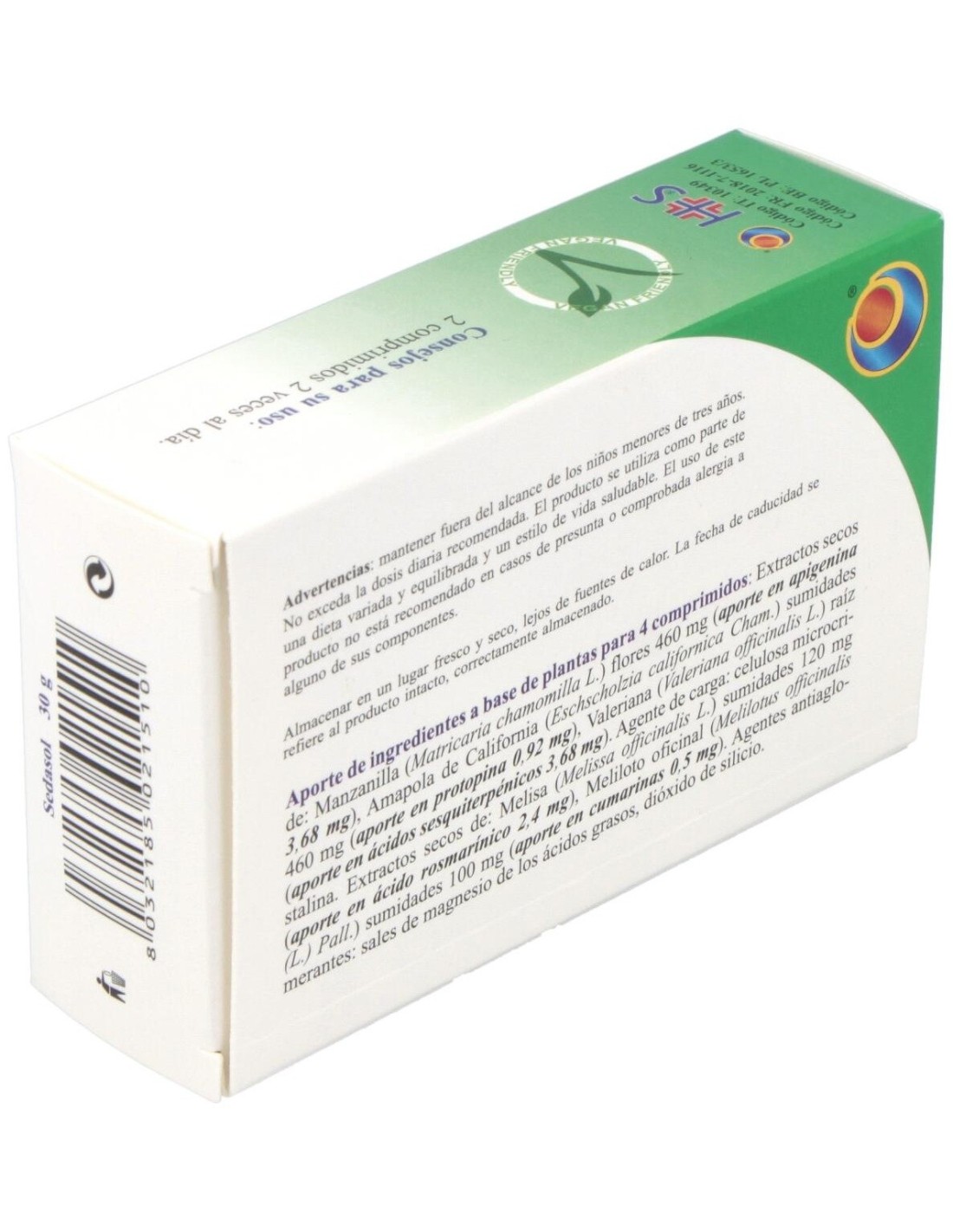Extractos secos de: Manzanilla (Matricaria chamomilla) flores 460 mg (aporte en apigenina 3,68 mg), Amapola de California (Eschscholtzia californica) sumidades 460 mg (aporte en protopina 0,92 mg), Valeriana (Valeriana officinalis) raíz 460 mg (aporte en ácidos sesquiterpénicos 3,68 mg). Agente de carga: celulosa microcristalina. Extractos secos de: Melisa (Melissa officinalis) sumidades 120 mg (aporte en ácido rosmarínico 2,4mg), Meliloto (Melilotus officinalis) sumidades 100 mg. (aporte en cumarina 0,5mg). Antiaglomerantes: sales de magnesio de los ácidos grasos, dióxido de silicio.