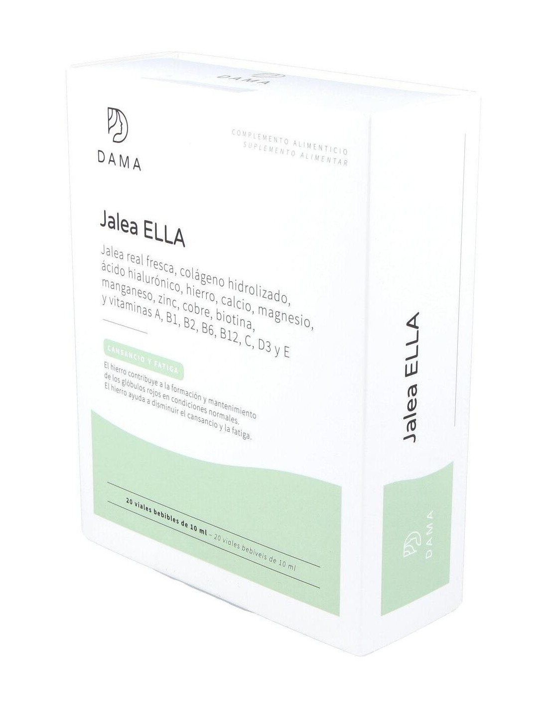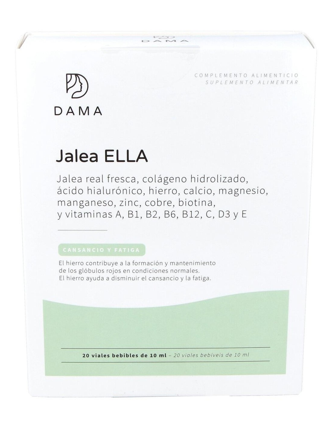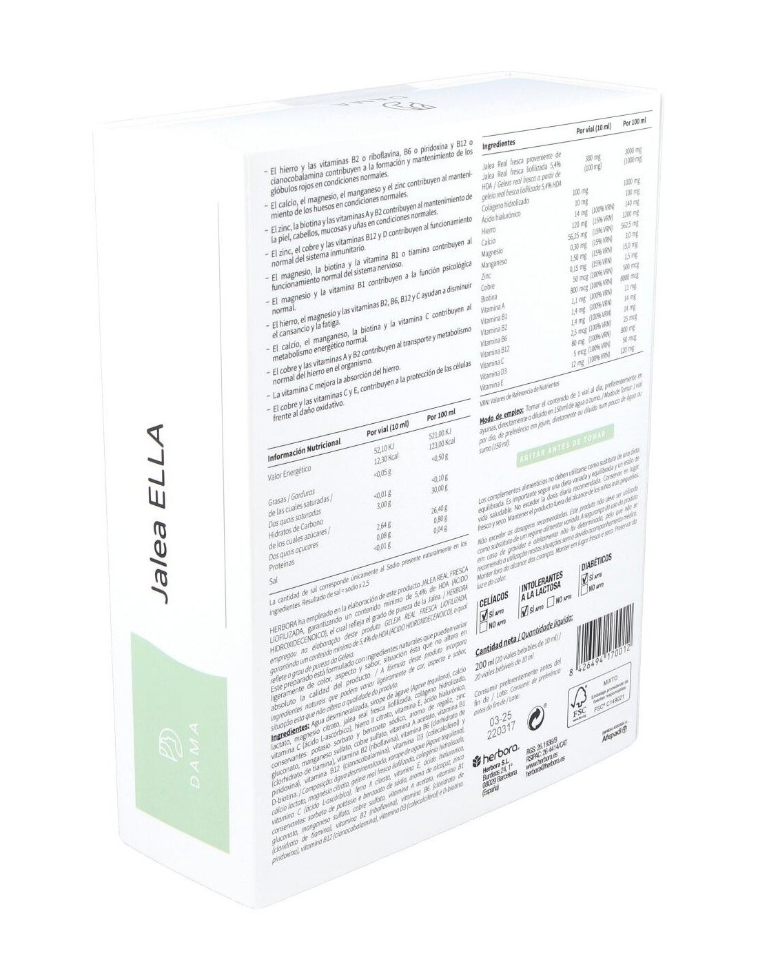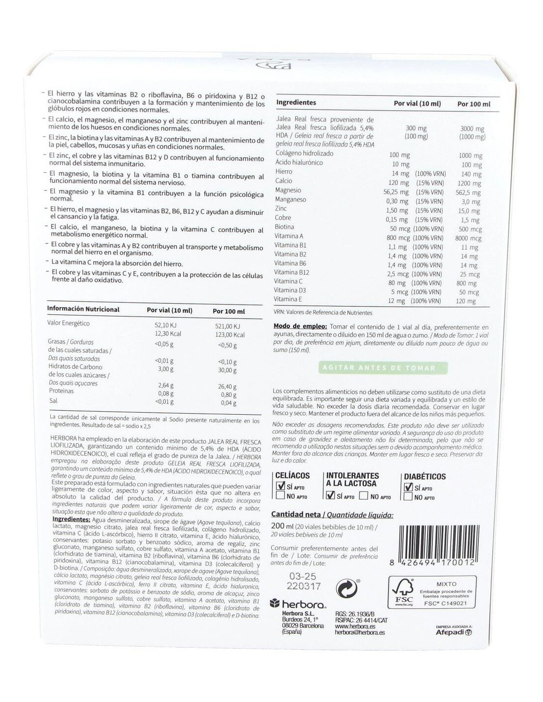 Jalea real fresca (proveniente de jalea real fresca liofilizada) 300 mg (100 mg), Colágeno hidrolizado 100 mg, Ácido hialurónico 10 mg, Hierro II 14 mg (100% VRN), Calcio 120 mg (15% VRN), Magnesio 56,25 mg (15% VRN), Manganeso 0,30 mg (15% VRN), Zinc 1,50 mg (15% VRN), Cobre 0,15 mg (15% VRN), Biotina 50 mcg (100% VRN), Vitamina A 800 mcg (100% VRN), Vitamina B1 1,1 mg (100% VRN), Vitamina B2 1,4 mg (100% VRN), Vitamina B6 1,4 mg (100% VRN), Vitamina B12 2,5 mcg (100% VRN), Vitamina C 80 mg (100% VRN), Vitamina D3 5 mcg (100% VRN), Vitamina E 12 mg (100% VRN). Otros ingredientes: Agua desmineralizada, sirope de ágave (Agave tequilana), conservantes (sorbato potásico y benzoato sódico) y aroma de regaliz.
