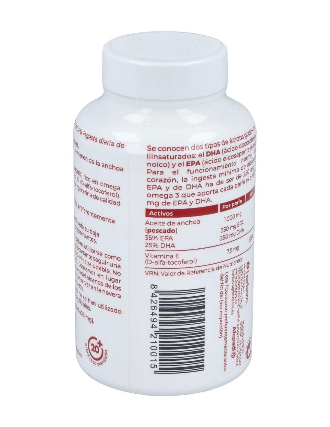 Aceite de anchoa (pescado) 1.000 mg, 35% EPA 350 mg EPA, 25% DHA 250 mg DHA, Vitamina E (D-alfa-tocoferol) 7,5 mg (62,5% VRN).