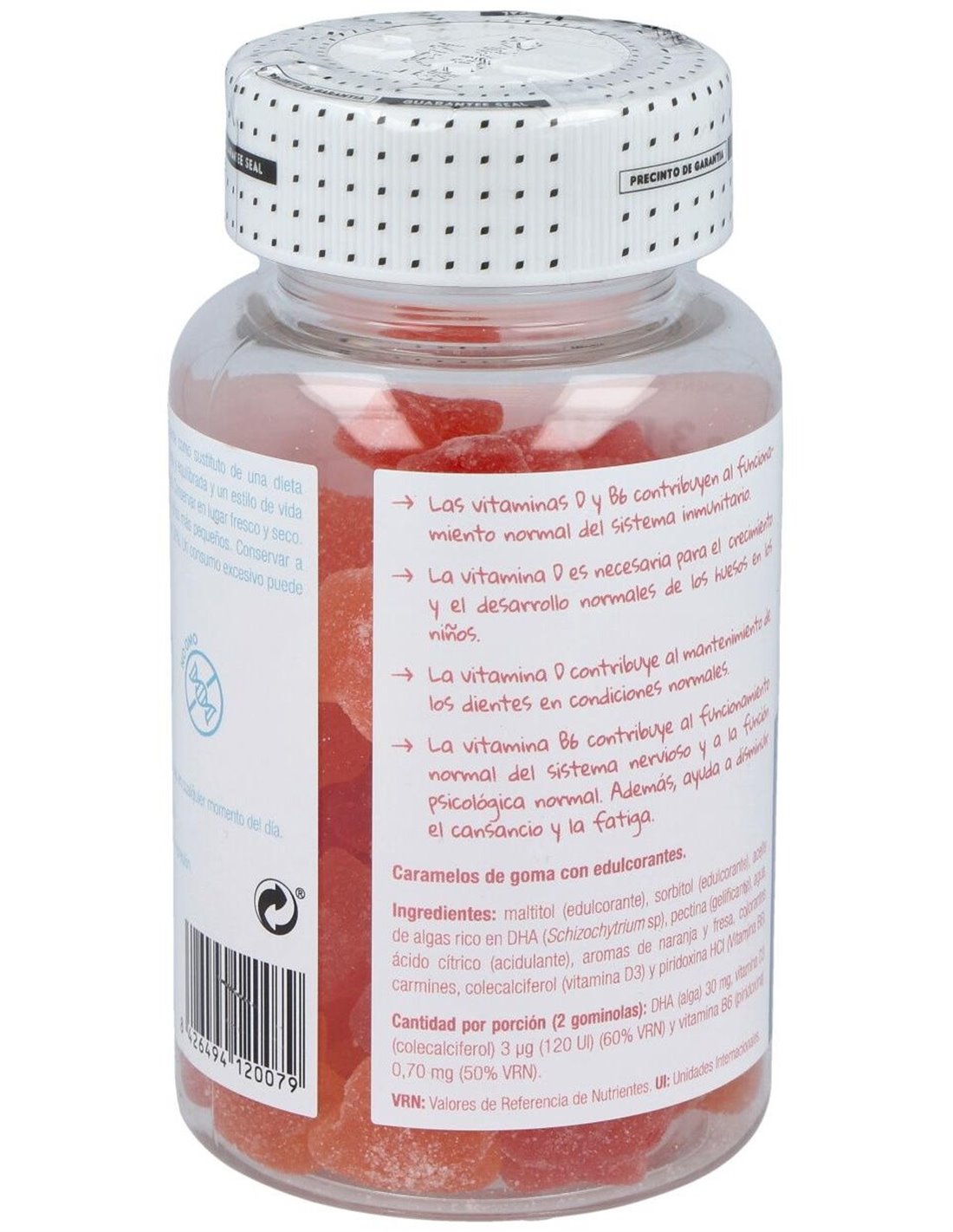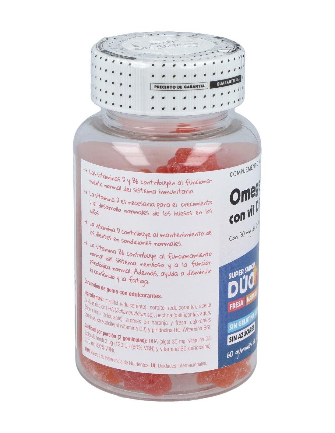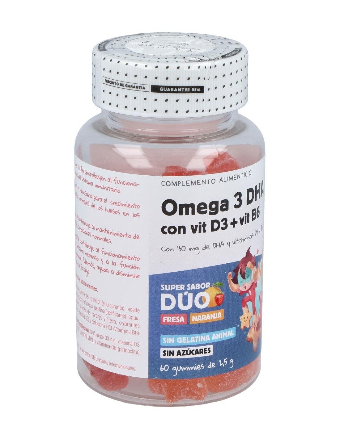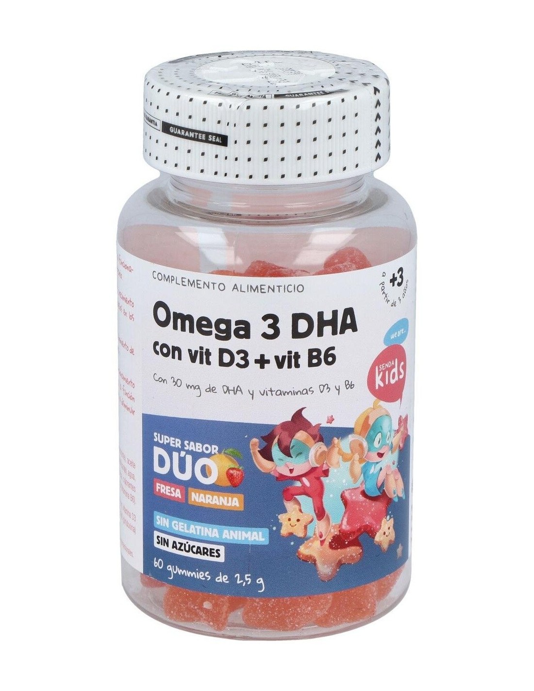 Complemento alimenticio especialmente desarrollado para la edad infantil, en forma de divertidas gominolas con sabores a fresa y naranja, elaborado a base de ácidos grasos omega 3 procedente de aceite de algas, muy rico en DHA.