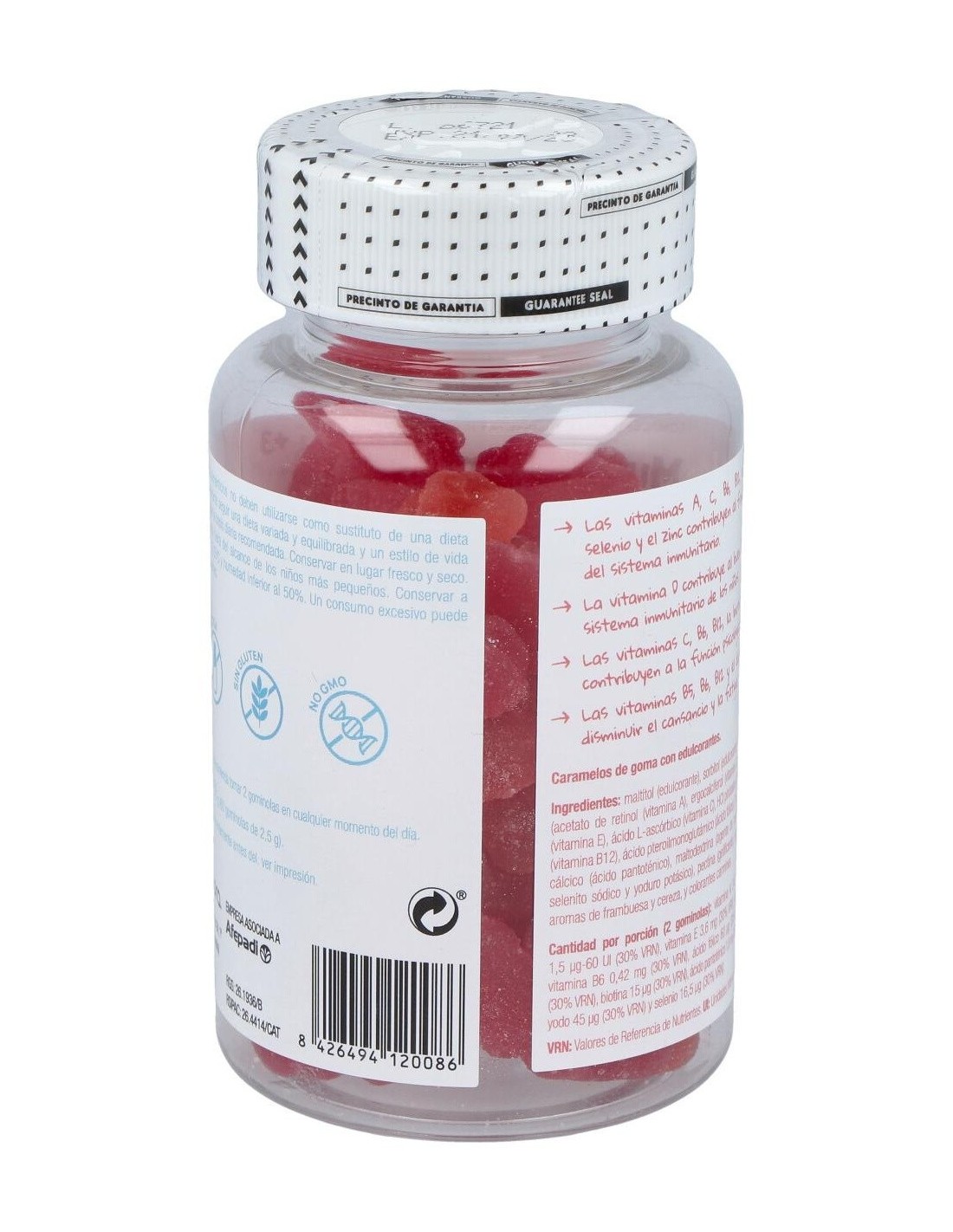 Gominolas para niños con sabor a cereza y frambuesa. Las vitaminas A, C, B6, B12, el ácido fólico, el selenio y el zinc contribuyen al funcionamiento normal del sistema