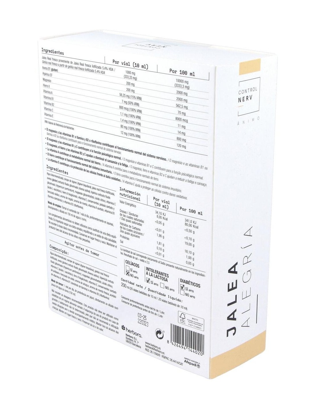 Producto que utiliza ingredientes de alta calidad como la jalea real, la avena y el hipérico, junto a minerales y vitaminas que actúan sobre el sistema nervioso y sobre la función psicológica normal. Apto para diabéticos e intolerantes a la lactosa.