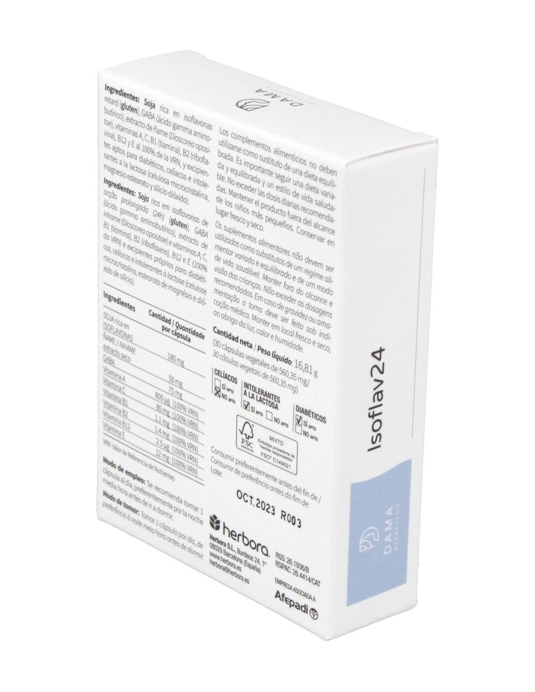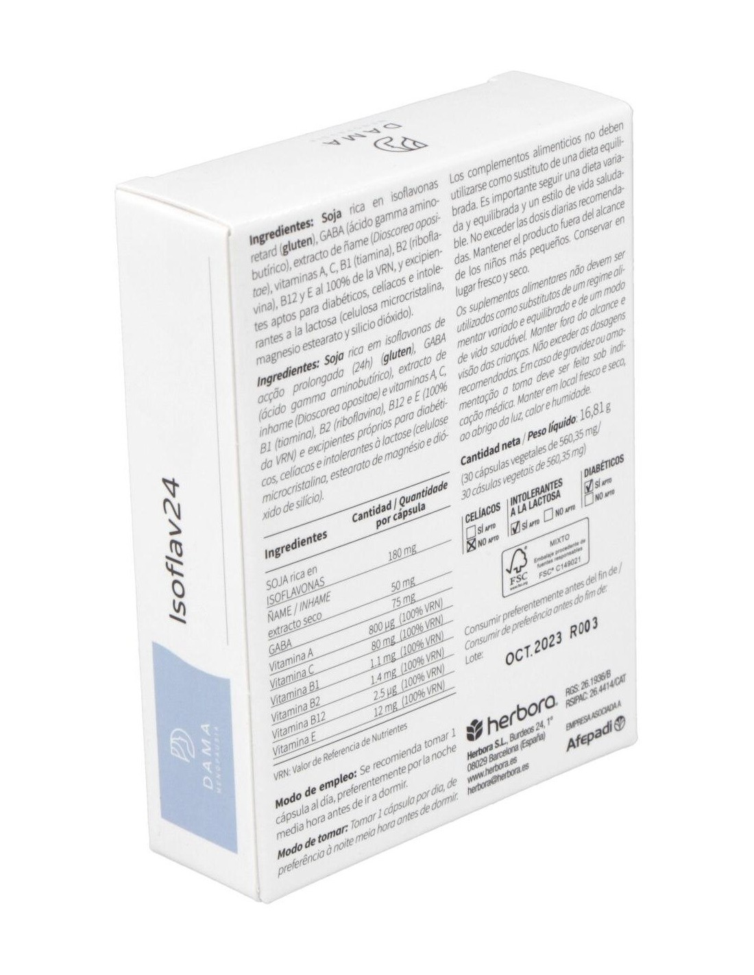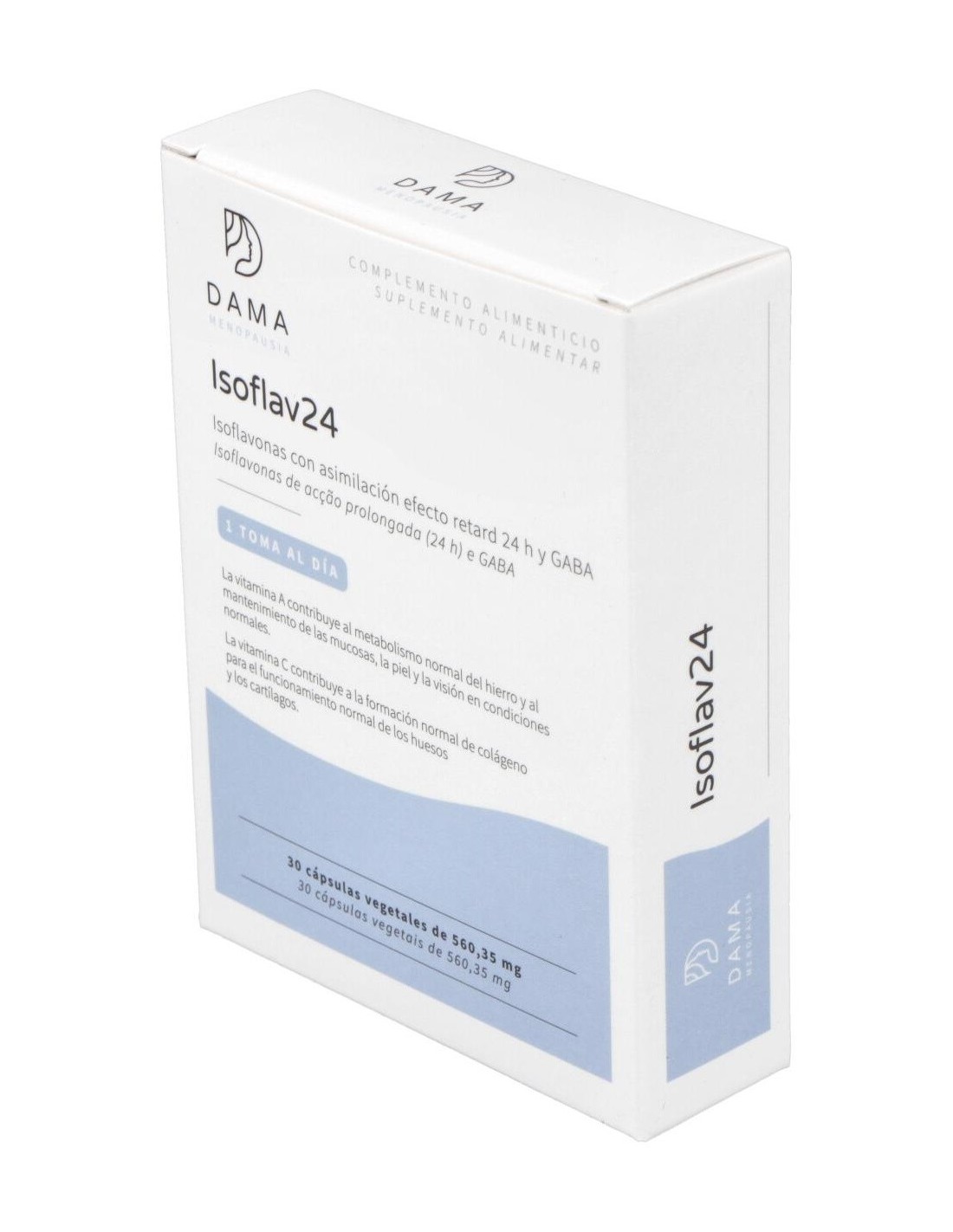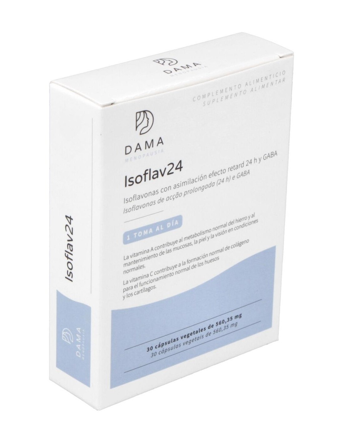 Producto con soja rica en isoflavonas, GABA (ácido gamma aminobutírico), extracto de ñame y vitaminas (A, C, B1, B2, B12 y E). Efecto 24 horas por la asimilación retard.