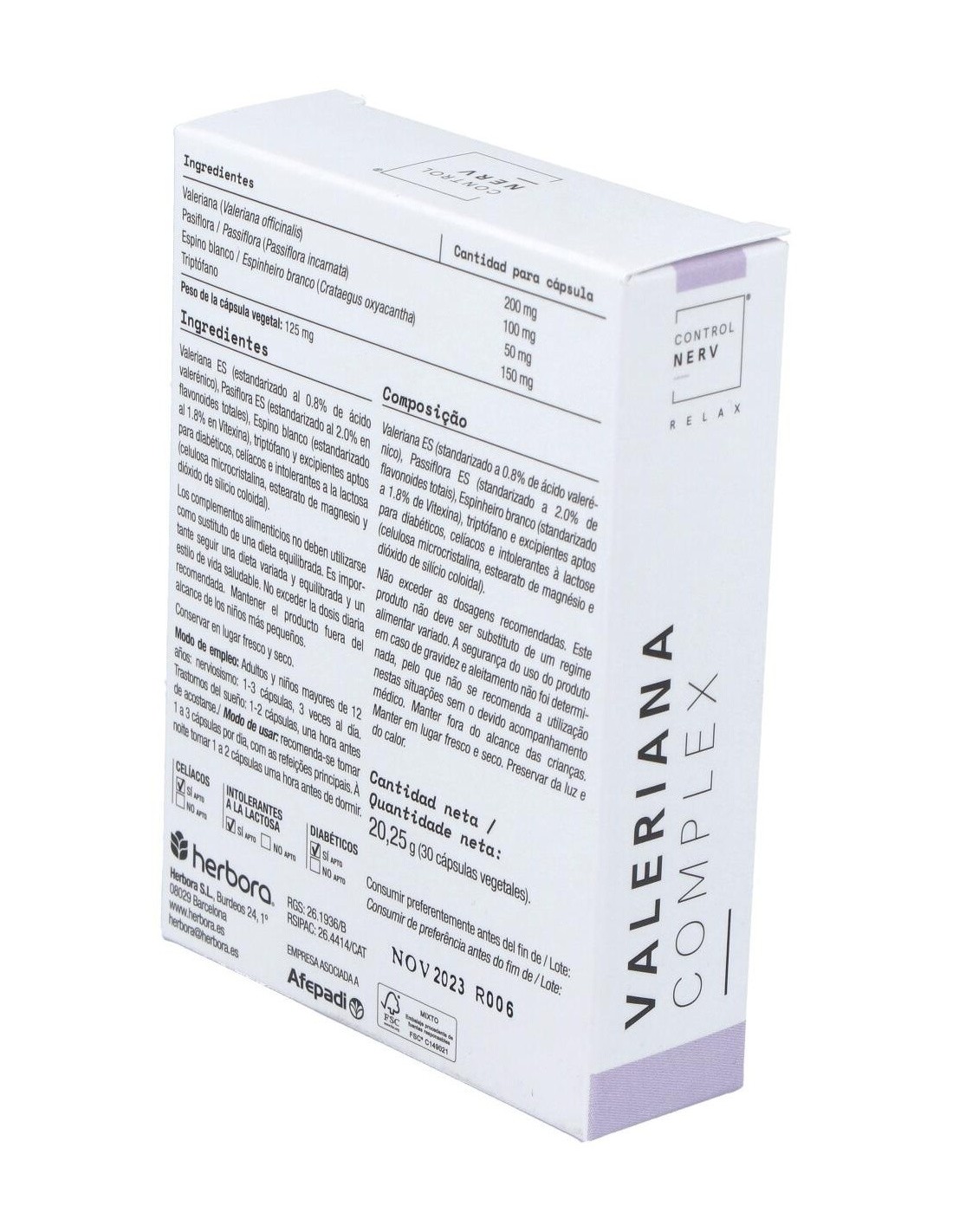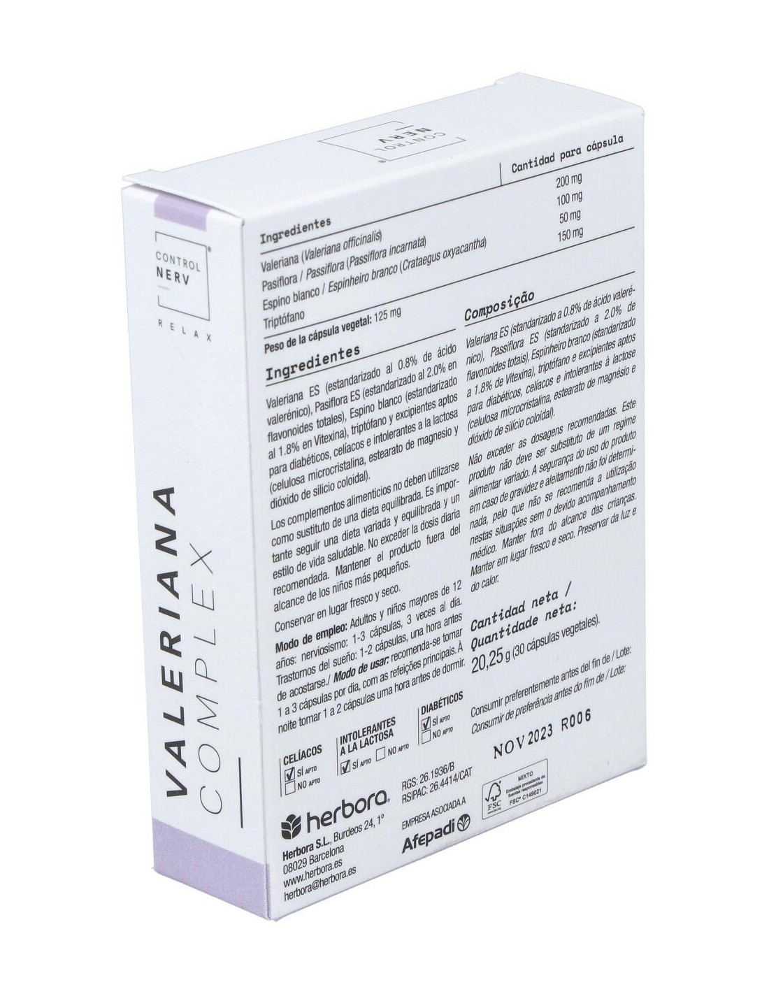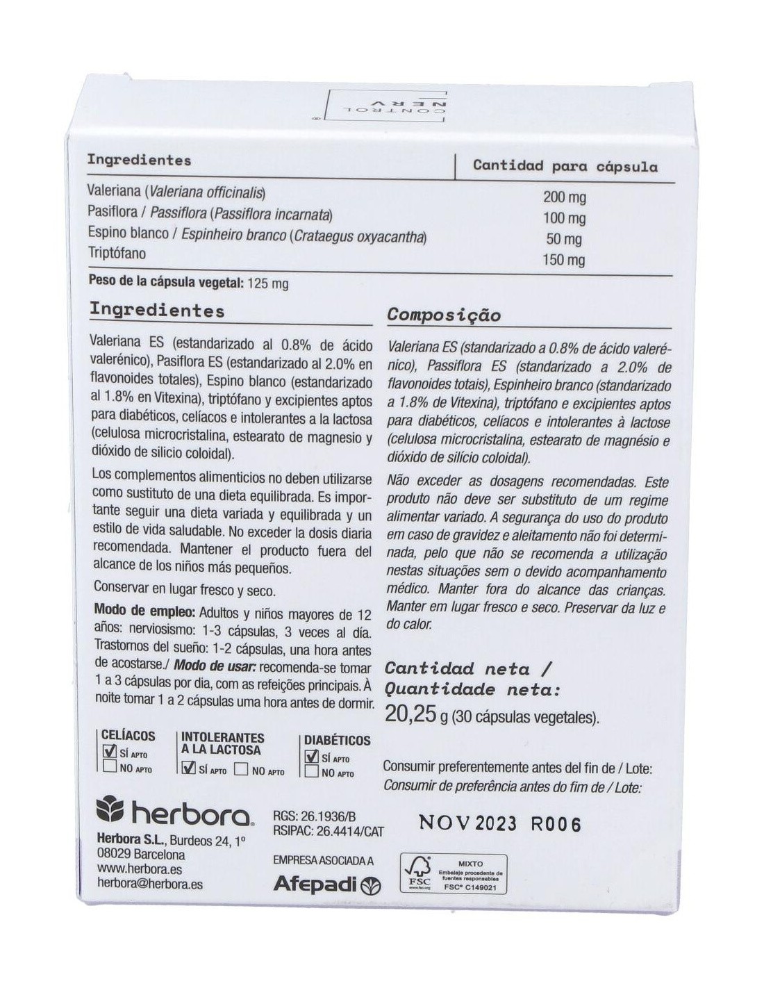 ES Valeriana (estandarizado al 0.8% de ácido valerénico): 200 mg, ES Pasiflora (estandarizado al 2.0% en flavonoides totales): 100 mg, ES Espino blanco (estandarizado al 1.8% en Vitexina): 50 mg, Triptófano: 150 mg. Otros ingredientes: Celulosa microcristalina, estearato de magnesio y dióxido de silicio.