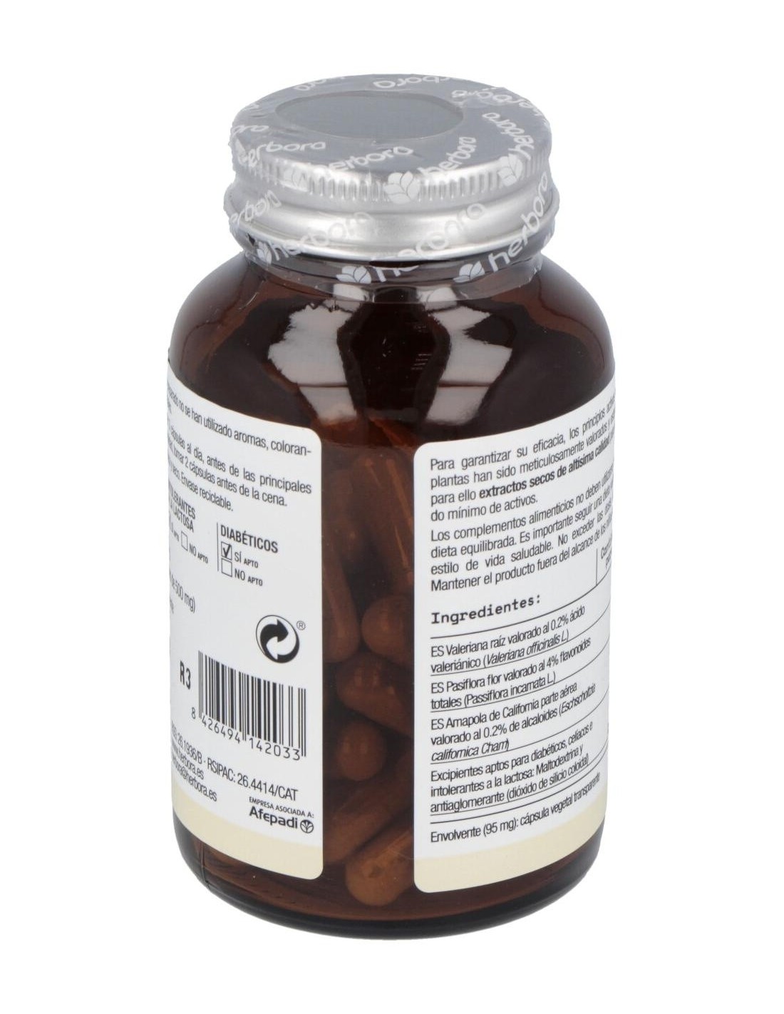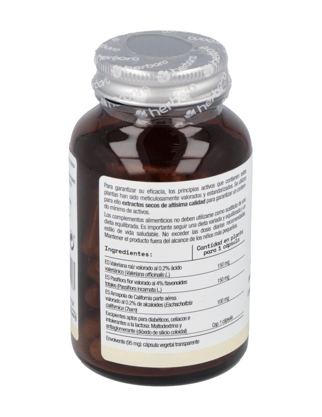 Complemento alimenticio en forma de cápsulas, que está indicado para ayudar a conciliar el sueño y ayudar a la relajación en situaciones de nerviosismo o estrés. Contiene una fórmula a base de tres extractos de plantas, amapola de California, valeriana y pasiflora.