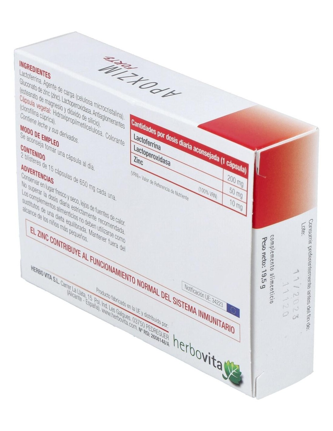 Apolactoferrina, Vitamina C (ácido L- ascórbico), Lactoperoxidasa, Celulosa microcristalina (agente de carga), Zinc (sulfato de zinc), Estearato de magnesio (antiaglomerante) y Dióxido de silicio (estabilizante).