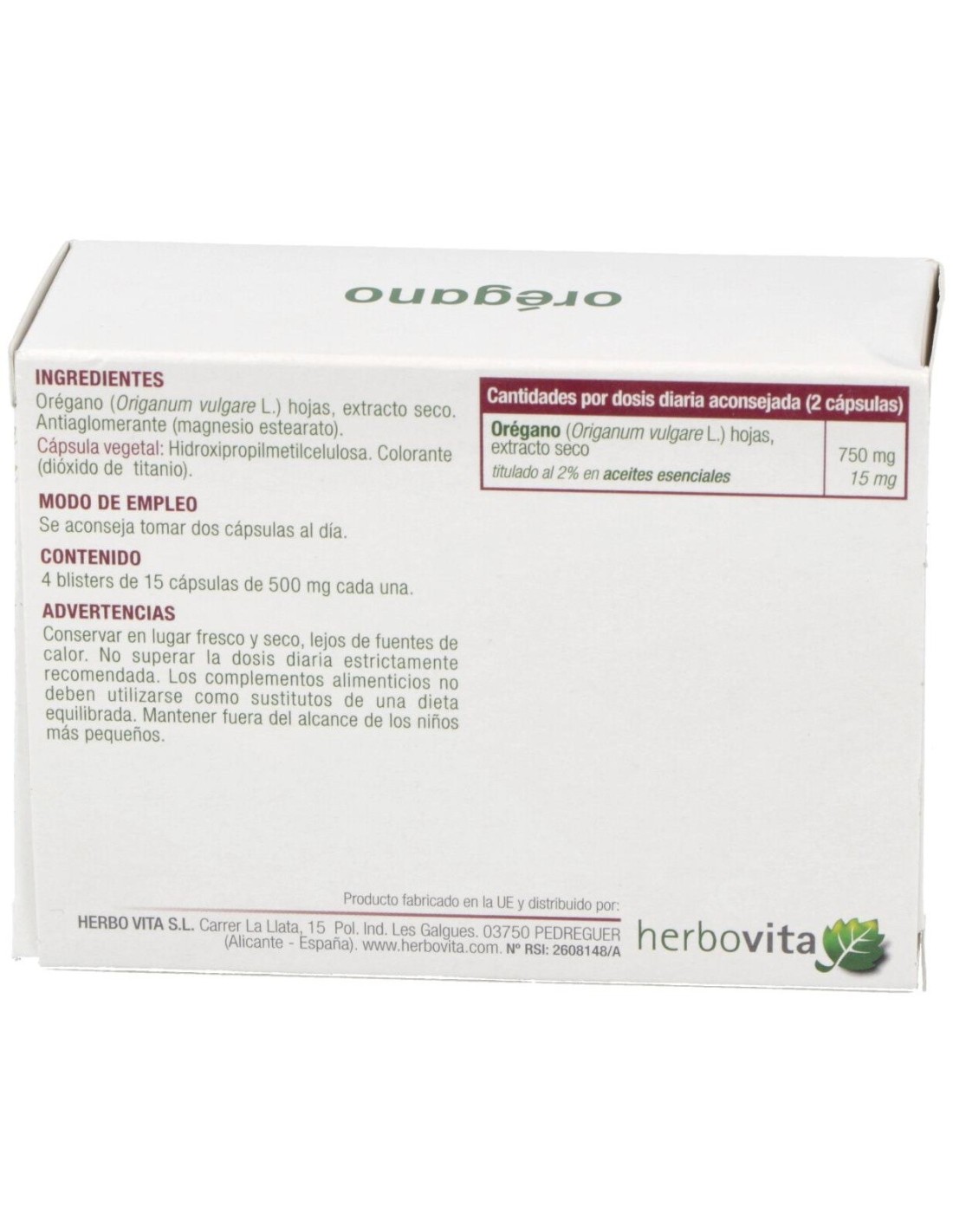 Orégano (Origanum vulgare L.) hojas, extracto seco. Antiaglomerante (magnesio estearato). Cápsula: Gelatina. Colorante (dióxido de titanio).