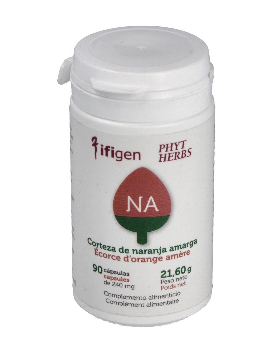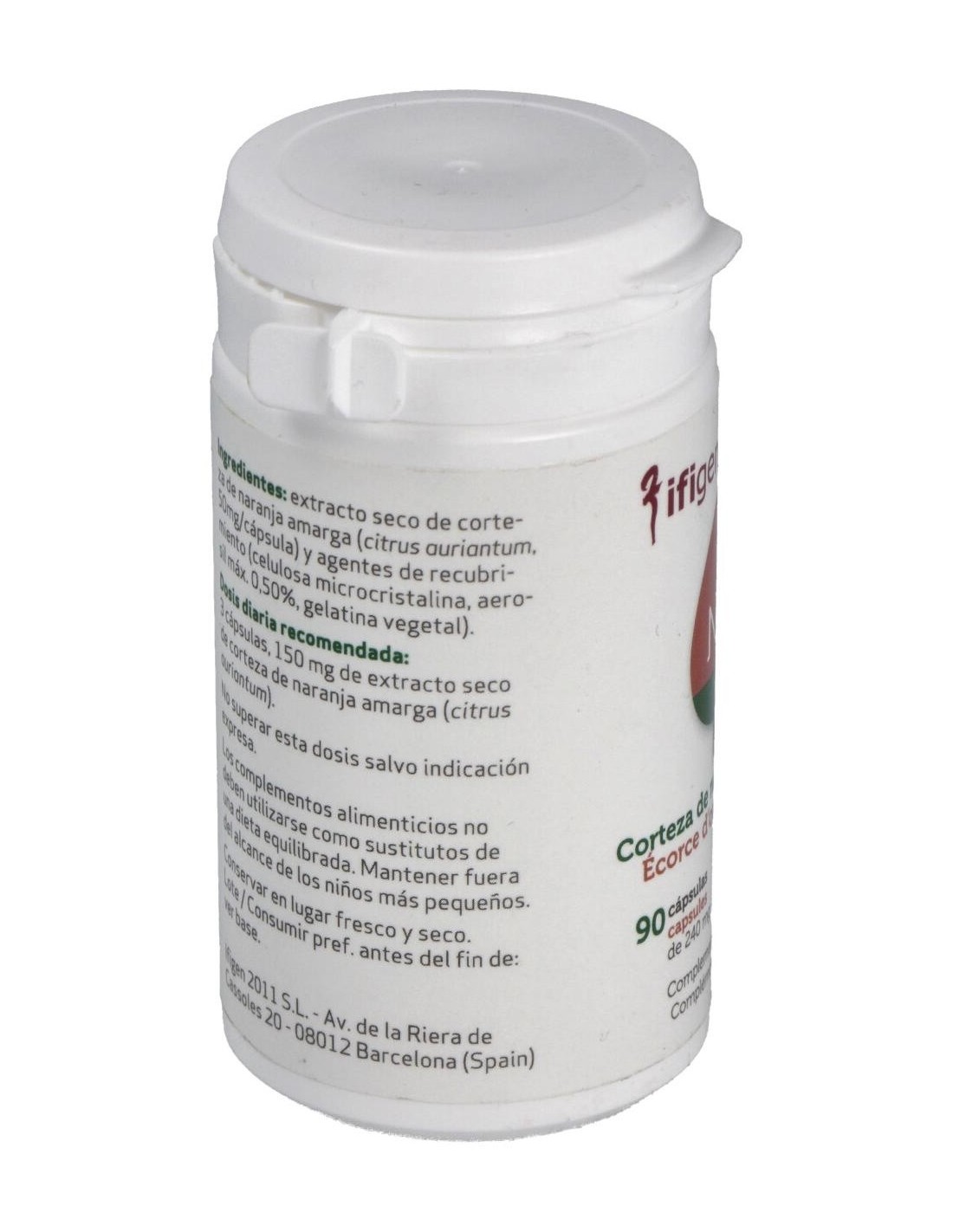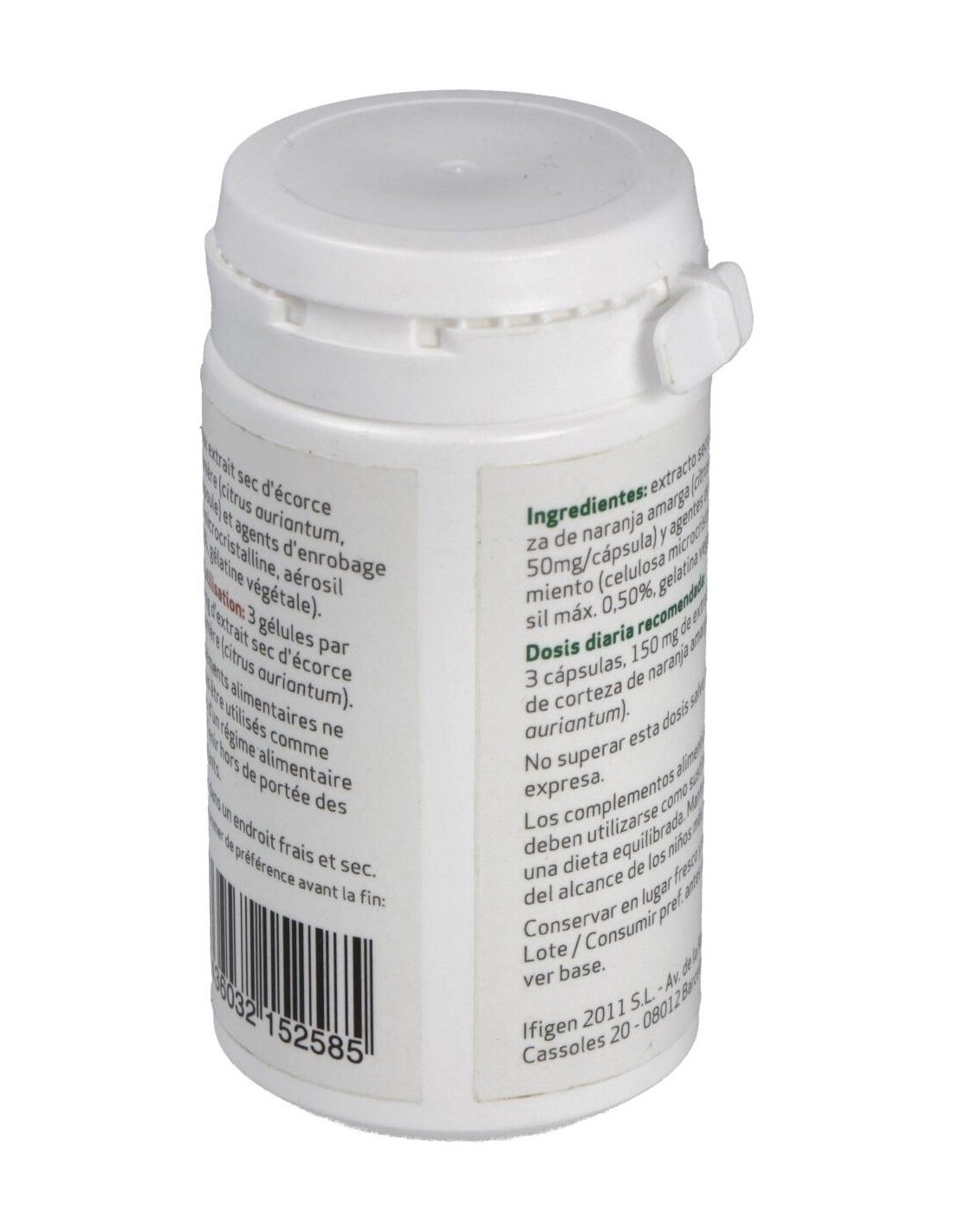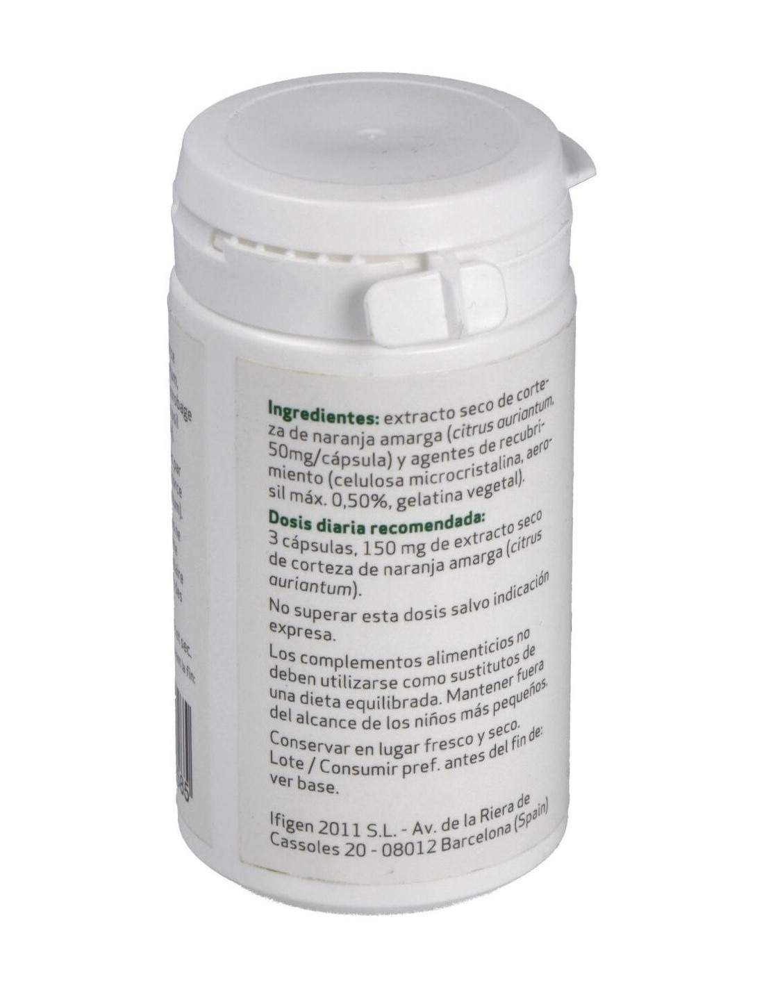 Extracto seco de corteza de naranja amarga (citrus auriantum, 50 mg/cápsula) y agentes de recubrimiento (celulosa microcristalina, aerosil máx. 0,5%, gelatina vegetal).