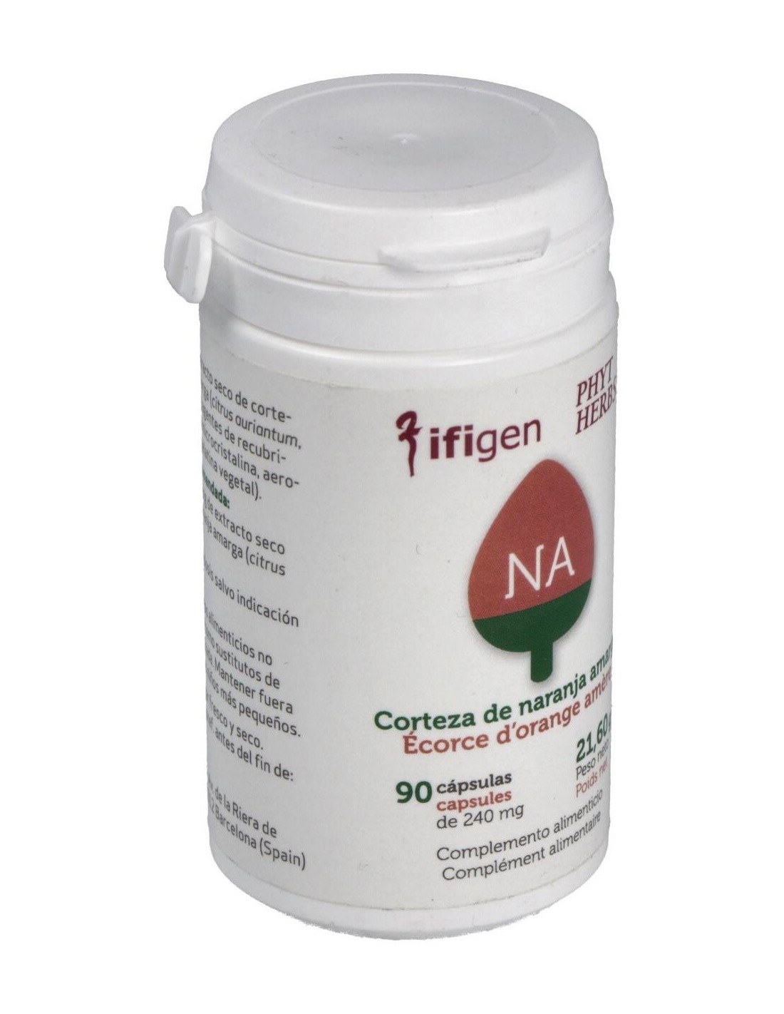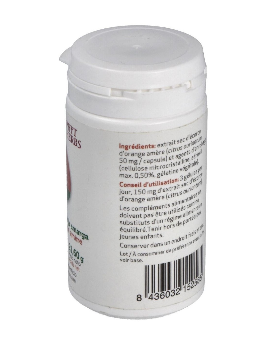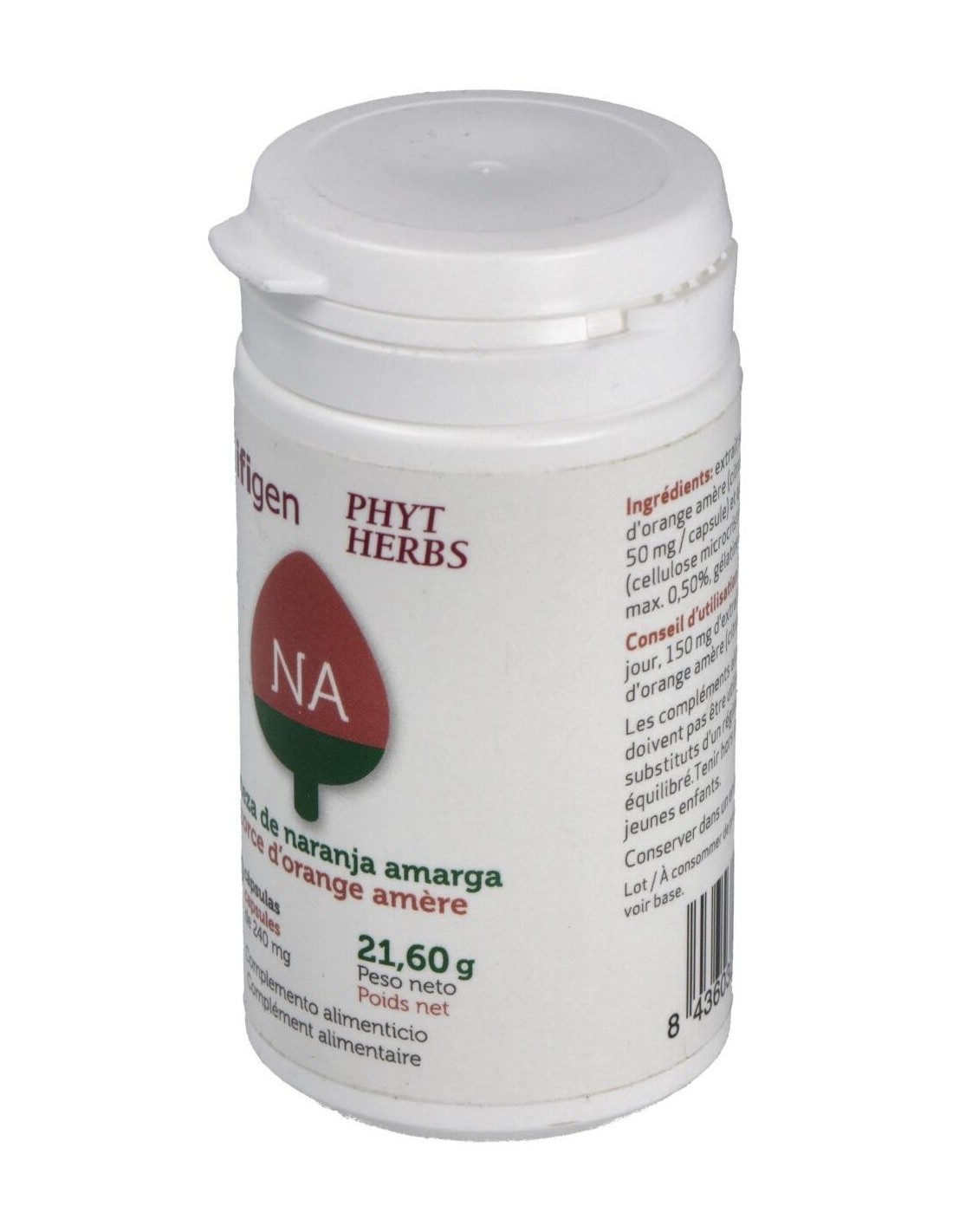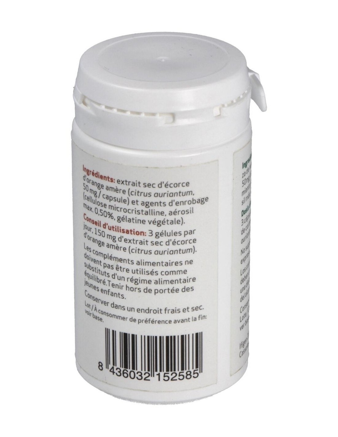 Extracto seco de corteza de naranja amarga (citrus auriantum, 50 mg/cápsula) y agentes de recubrimiento (celulosa microcristalina, aerosil máx. 0,5%, gelatina vegetal).