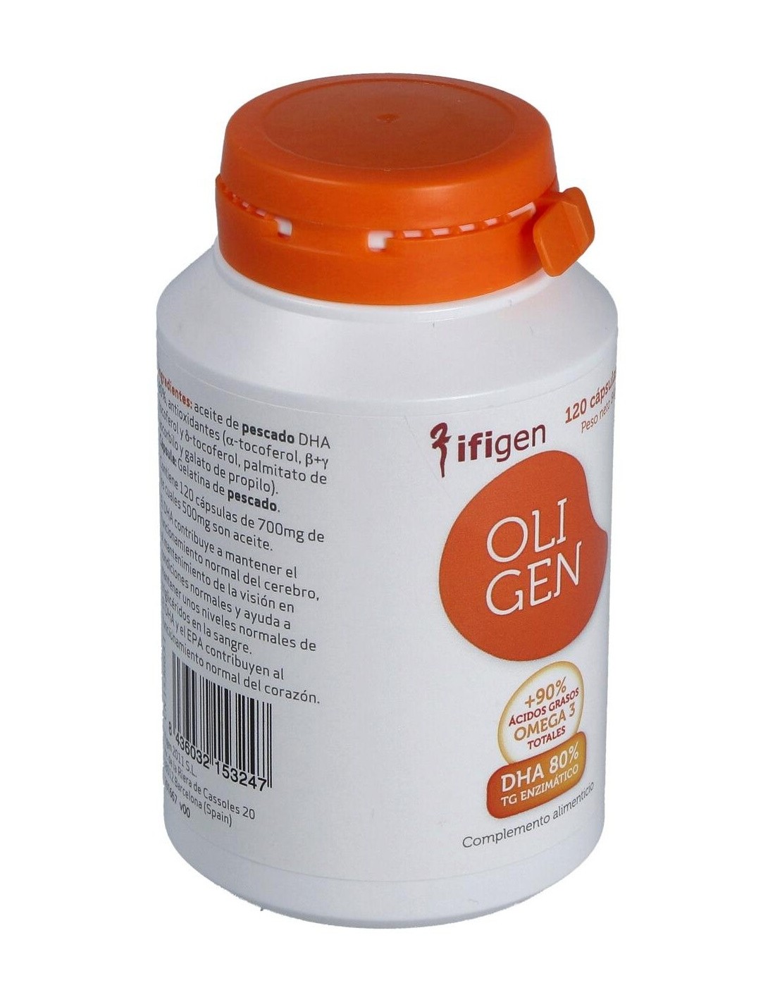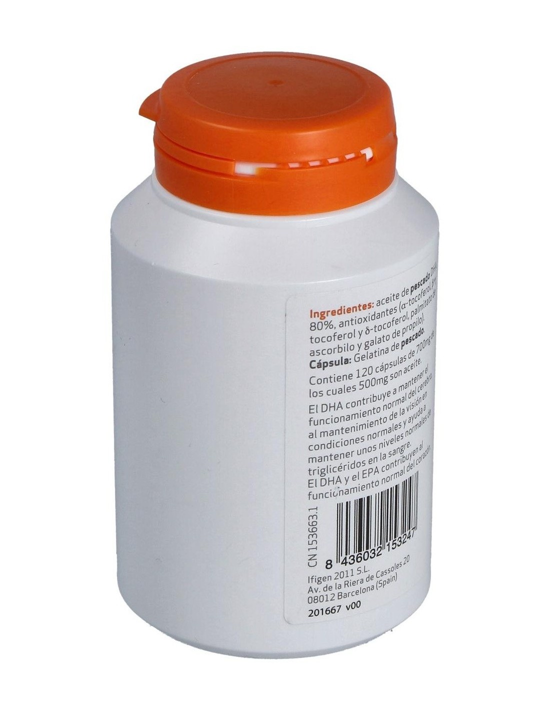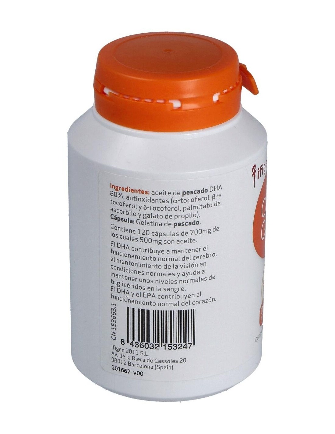 Aceite de pescado DHA 80% antioxidantes (alfa-tocoferol, ß y tocoferol, ð-tocoferol, palmitato de ascorbilo y galato de propilo). Cápsula: gelatina de pescado.