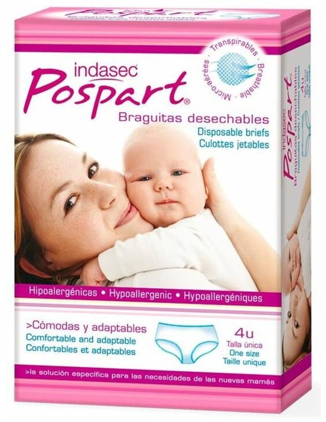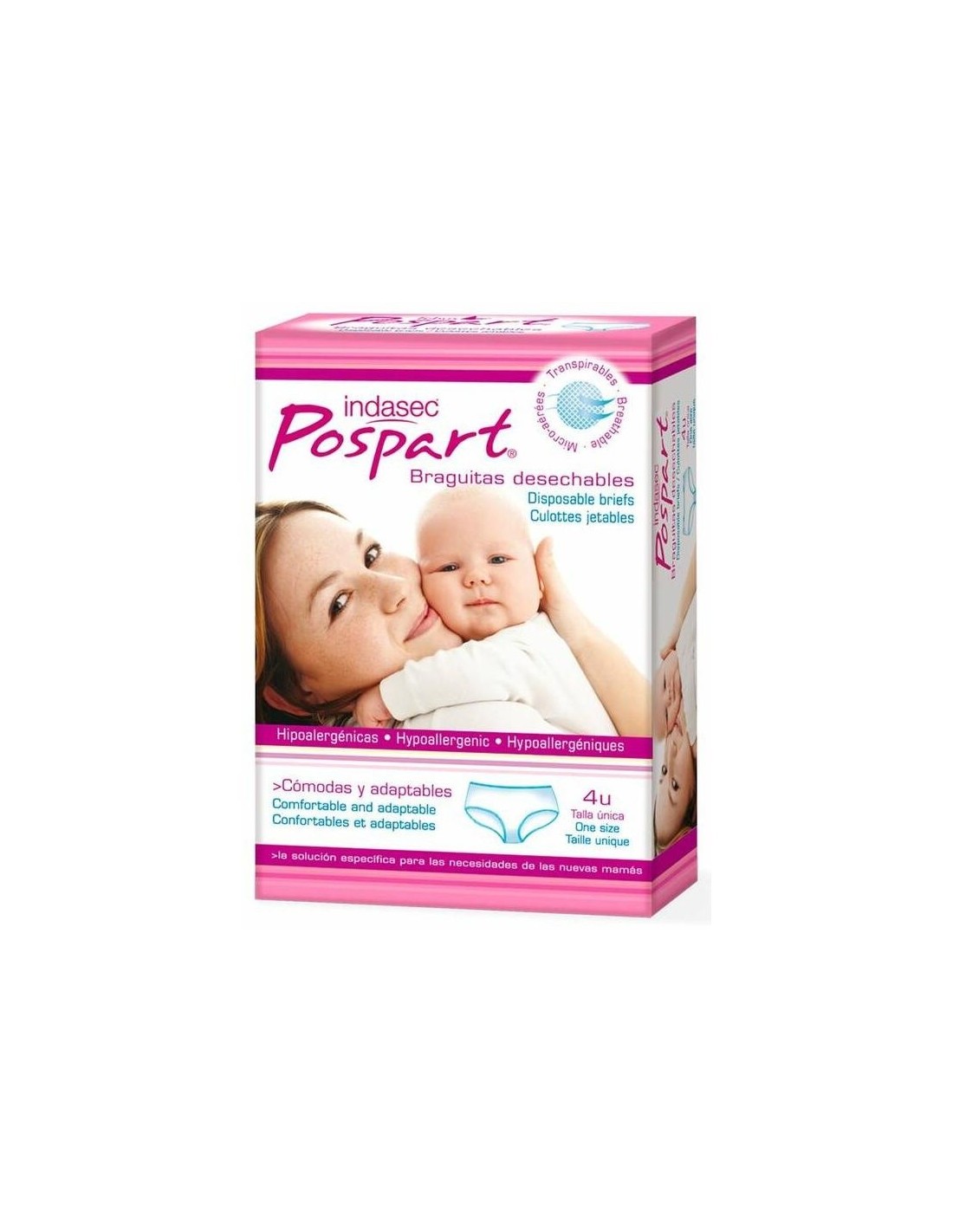 Braguitas Indasec® Pospart desechables han sido diseñadas para los días posteriores al parto, especialmente indicadas para sujetar las compresas Indasec® Pospart primero días. Estas braguitas son un producto higiénico desechable e hipoalergénicas. Su presentación es en un envase individual.