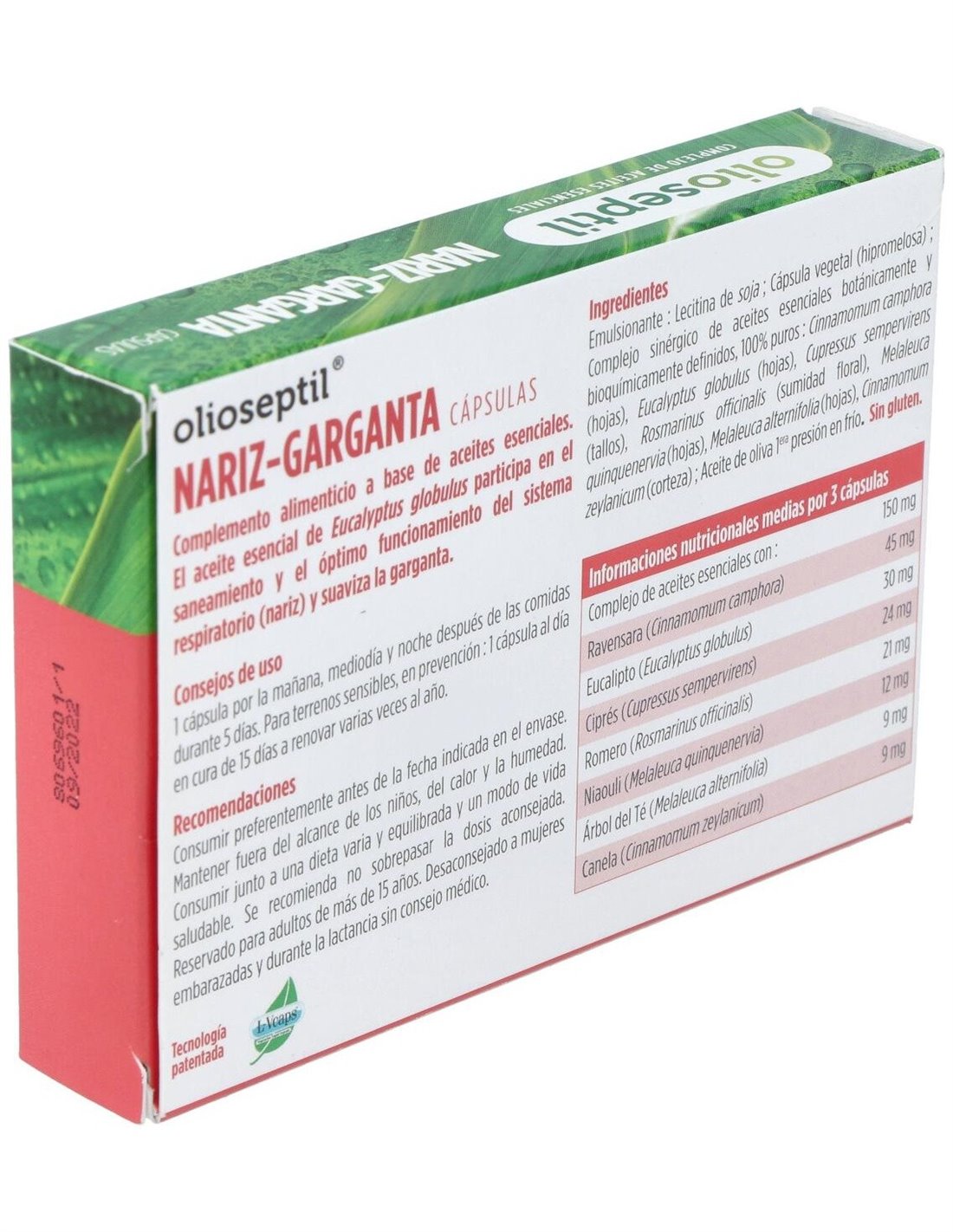 Emulsionante: lecitina de soja: Cápsula vegetal (hipromelosa): Complejo sinérgico de aceites esenciales definidos botánicamente y bioquímicamente: Rosmarinus officinalis 100% puro, Abies siberica (agujas), Melaleuca quinquenervia (hojas), Cinnamomum camphora (hojas), Mentha arvensis (hojas), Citrus limonum , Eugenia caryophyllus (uñas): Aceite de oliva 1ª presión prensado en frío
