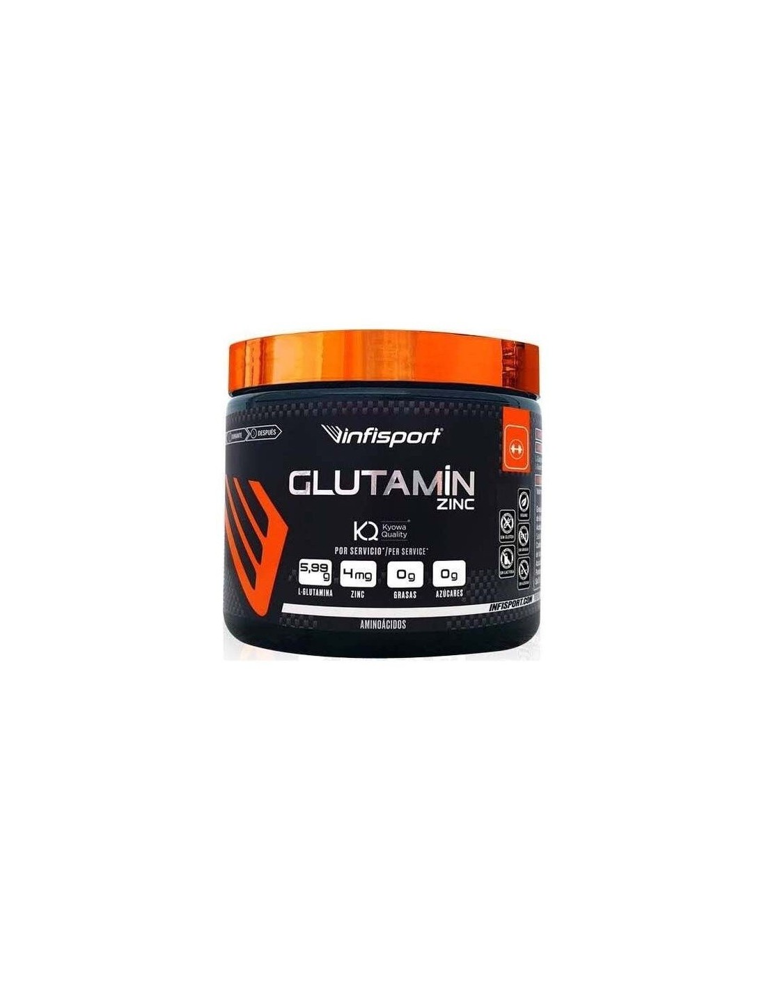 INFISPORTGLUTAMIN ZINC aporta L-glutamina (Kyowa Quality®), así como zinc, micronutriente relacionado con muchas funciones, entre otras, contribuye al funcionamiento normal del sistema inmunitario y a la protección de las células frente al daño oxidativo. Además, la adición de vitamina B6 a la formulación, contribuye al metabolismo normal de las proteínas y del glucógeno.