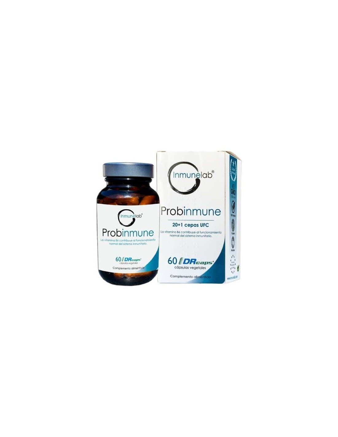 INMUNELABCápsula gastrorresistentes con garantía de estabilidad DRcaps, 2 extractos prebióticos, almidón resistente grado III y L-Glutamina. Esta formulación probiótica se enriquece con vitamina B6 que contribuye al funcionamiento normal del sistema inmune. Producto vegano.\ \ Probinmune de Inmunelab es un complemento alimenticio simbiótico que contiene una combinación única de 20 cepas de microorganismos y un extracto prebiótico vegetal para ayudar a mantener el normal desempeño intestinal e inmunológico. Además de las cepas probióticas, también incluye almidón de patata resistente grado III, L-Glutamina y Vitamina B6. La fórmula de Probinmune es diseñada para ayudar a que los microorganismos lleguen al intestino en condiciones normales. Las cápsulas vegetales gastrorresistentes aseguran que los microorganismos estén protegidos contra los ácidos gástricos y biliares, lo que apoya a que lleguen al intestino donde pueden prosperar y proporcionar beneficios. El extracto seco de Melena de león (Hericium erinaceus) proporciona alimento para los microorganismos beneficiosos, mientras que el almidón de patata resistente grado III es un prebiótico que ayuda a promover la proliferación de estas cepas. El extracto seco de Kudzu (Pueraria lobata) es un superalimento para los microorganismos, y la L-Glutamina ayuda a mantener el revestimiento intestinal en condiciones normales. La vitamina B6 es un cofactor de la L-Glutamina y contribuye al funcionamiento normal del sistema inmunitario.